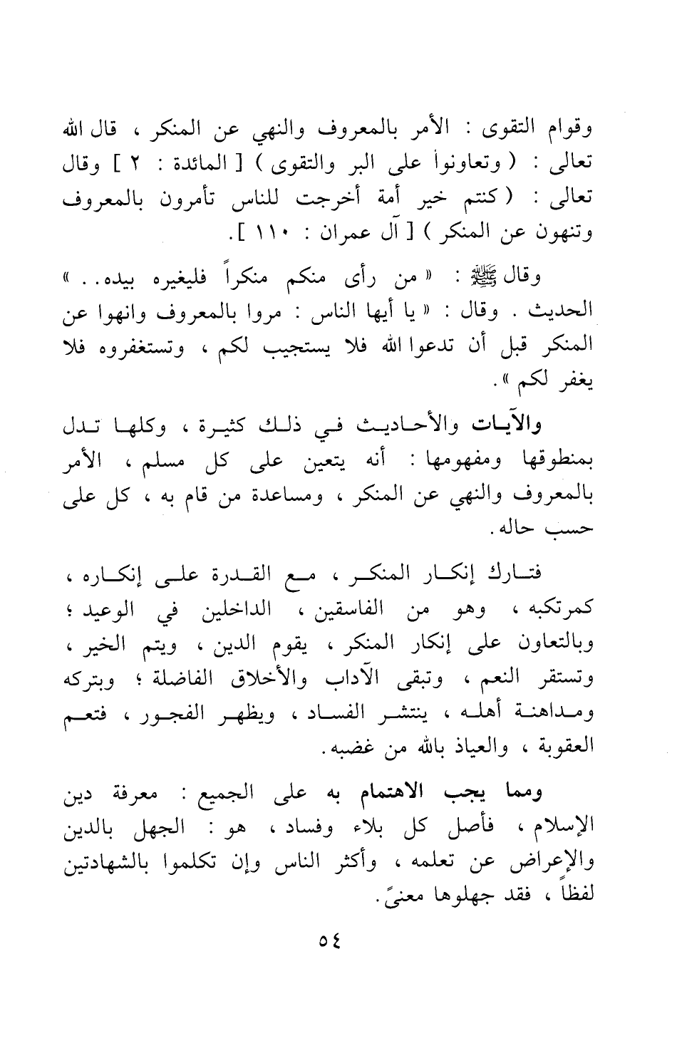 وقوام التقوى: الأمر بالمعروف والنهي عن المنكر، قال الله تعالى: {وَتَعَاوَنُوا عَلَى الْبِرِّ وَالتَّقْوَى} [سورة المائدة آية: 2] وقال تعالى: {كُنْتُمْ خَيْرَ أُمَّةٍ أُخْرِجَتْ لِلنَّاسِ تَأْمُرُونَ بِالْمَعْرُوفِ وَتَنْهَوْنَ عَنِ الْمُنْكَرِ} [سورة آل عمران آية: 110] .