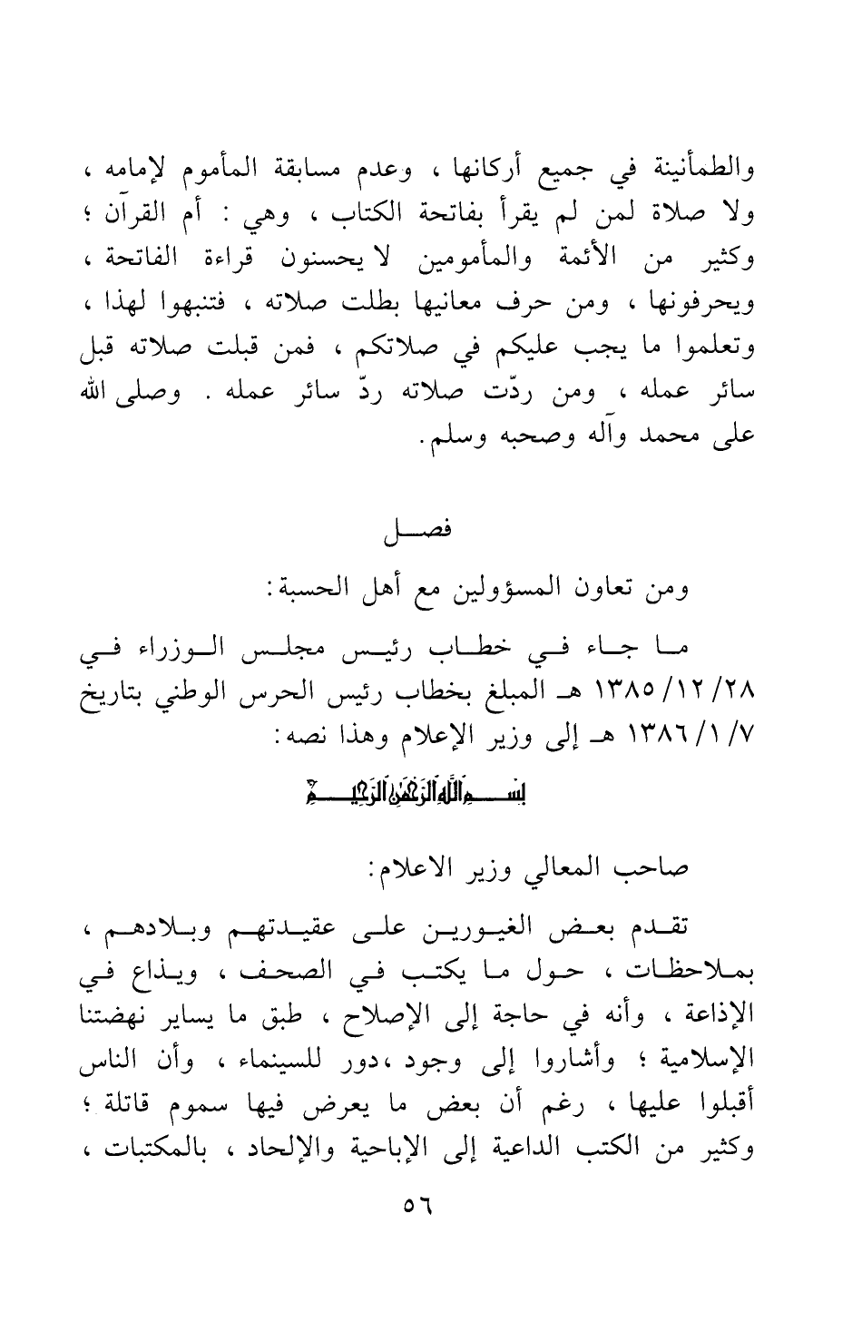 ما جاء في خطاب رئيس مجلس الوزراء في 28/ 12/ 1385 هـ المبلغ بخطاب رئيس الحرس الوطني بتاريخ 7/1/ 1386 هـ إلى وزير الإعلام وهذا نصه:
