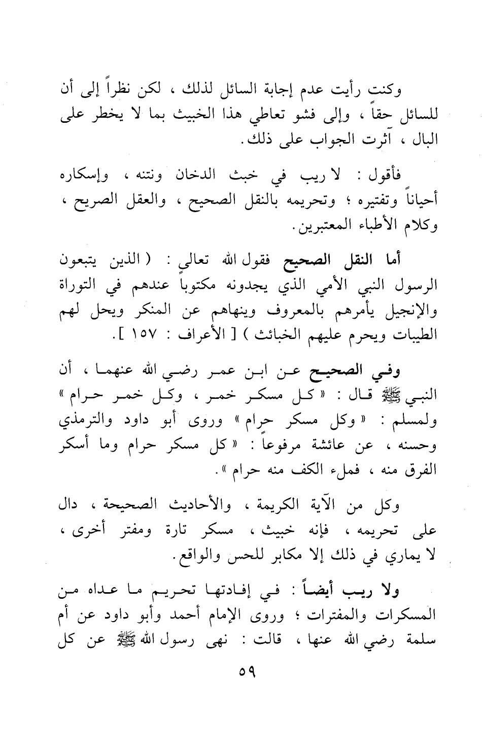 وفي الصحيح عن ابن عمر رضي الله عنهما، أن النبي صلى الله عليه وسلم قال: "كل مسكر خمر، وكل خمر حرام" 1، ولمسلم: "وكل مسكر حرام" 2، وروى أبو داود والترمذي وحسنه، عن عائشة موفوعا: "كل مسكر حرام، وما أسكر الفرق منه، فملء الكف منه حرام" 3. وكل من الآية الكريمة، والأحاديث الصحيحة دال على تحريمه، فإنه خبيث، مسكر تارة ومفتر أخرى؛ لا يماري في ذلك إلا مكابر للحس والواقع.