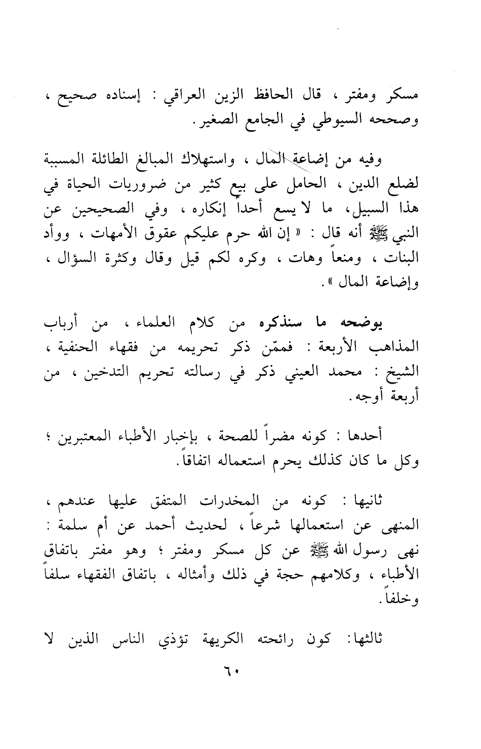 ثانيها: كونه من المخدرات المتفق عليها عندهم، المنهي عن استعمالها شرعا، لحديث أحمد عن أم سلمة: (نهى رسول الله صلى الله عليه وسلم عن كل مسكر ومفتر) ، وهو مفتر باتفاق الأطباء؛ وكلامهم حجة في ذلك وأمثاله، باتفاق الفقهاء سلفا وخلفا.
