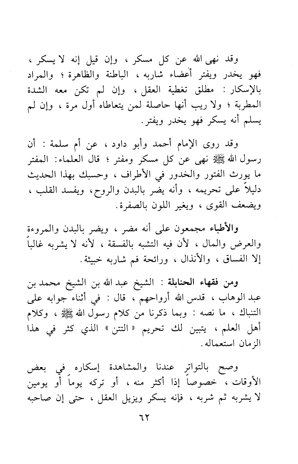 وقد نهى الله عن كل مسكر، وإن قيل إنه لا يسكر فهو يخدر ويفتر أعضاء شاربه، الباطنة والظاهرة، والمراد بالإسكار: مطلق تغطية العقل، وإن لم تكن معه الشدة المطربة. ولا ريب أنها حاصلة لمن يتعاطاه أول مرة، وإن لم يسلم أنه يسكر فهو يخدر ويفتر.