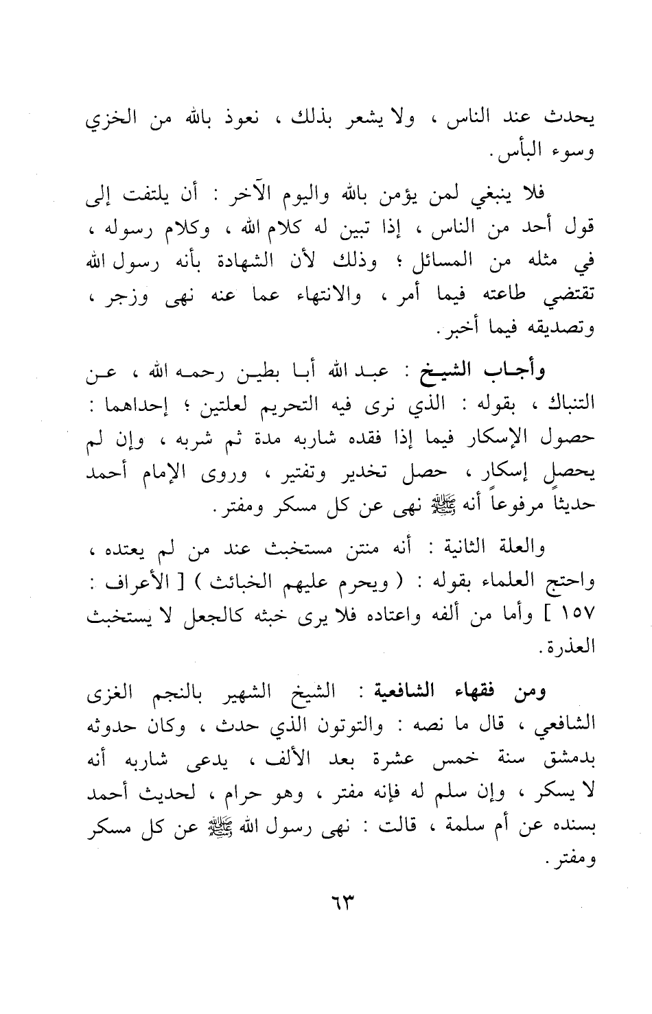 وأجاب الشيخ: عبد الله أبا بطين رحمه الله، عن التنباك بقوله: الذي نرى فيه التحريم لعلتين: إحداهما: حصول الإسكار فيما إذا فقده شاربه مدة ثم شربه، وإن لم يحصل إسكار، حصل تخدير وتفتير، وروى الإمام أحمد حديثا مرفوعا أنه صلى الله عليه وسلم "نهى عن كل مسكر ومفتر" 1.