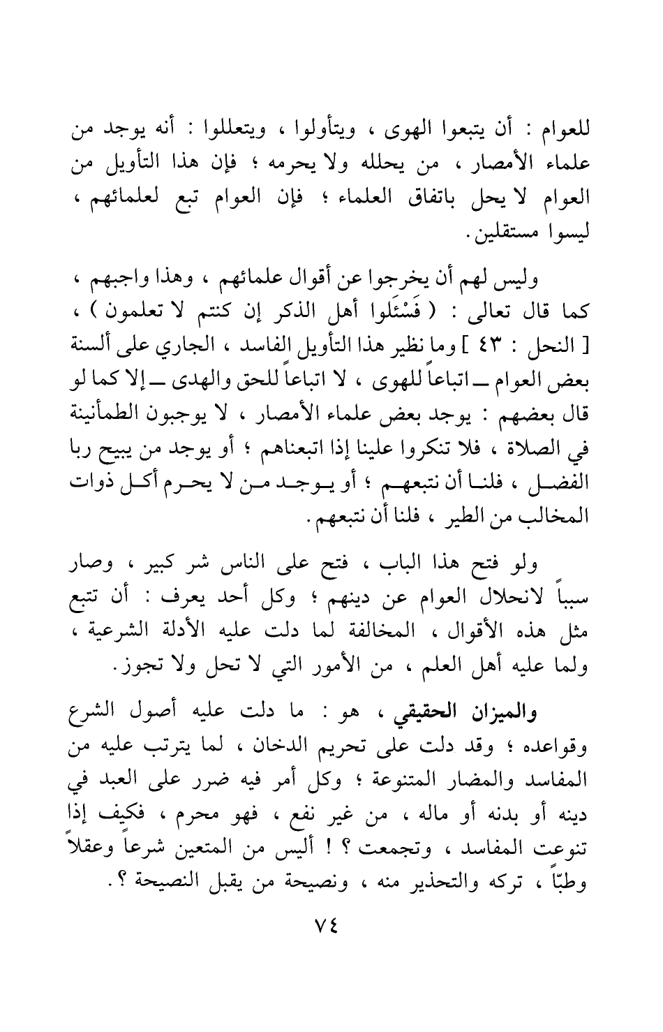 وليس لهم أن يخرجوا عن أقوال علمائهم، وهذا واجبهم، كما قال تعالى: {فَاسْأَلوا أَهْلَ الذِّكْرِ إِنْ كُنْتُمْ لا تَعْلَمُونَ} [سورة النحل آية: 43] . وما نظير هذا التأويل الفاسد الجاري على ألسنة بعض العوام- اتباعا للهوى، لا اتباعا للحق والهدى- إلا كما لو قال بعضهم: يوجد بعض علماء الأمصار لا يوجبون الطمأنينة في الصلاة، فلا تنكروا علينا إذا اتبعناهم، أو يوجد من يبيح ربا الفضل، فلنا أن نتبعهم، أو يوجد من لا يحرم أكل ذوات المخالب من الطير، فلنا أن نتبعهم.
