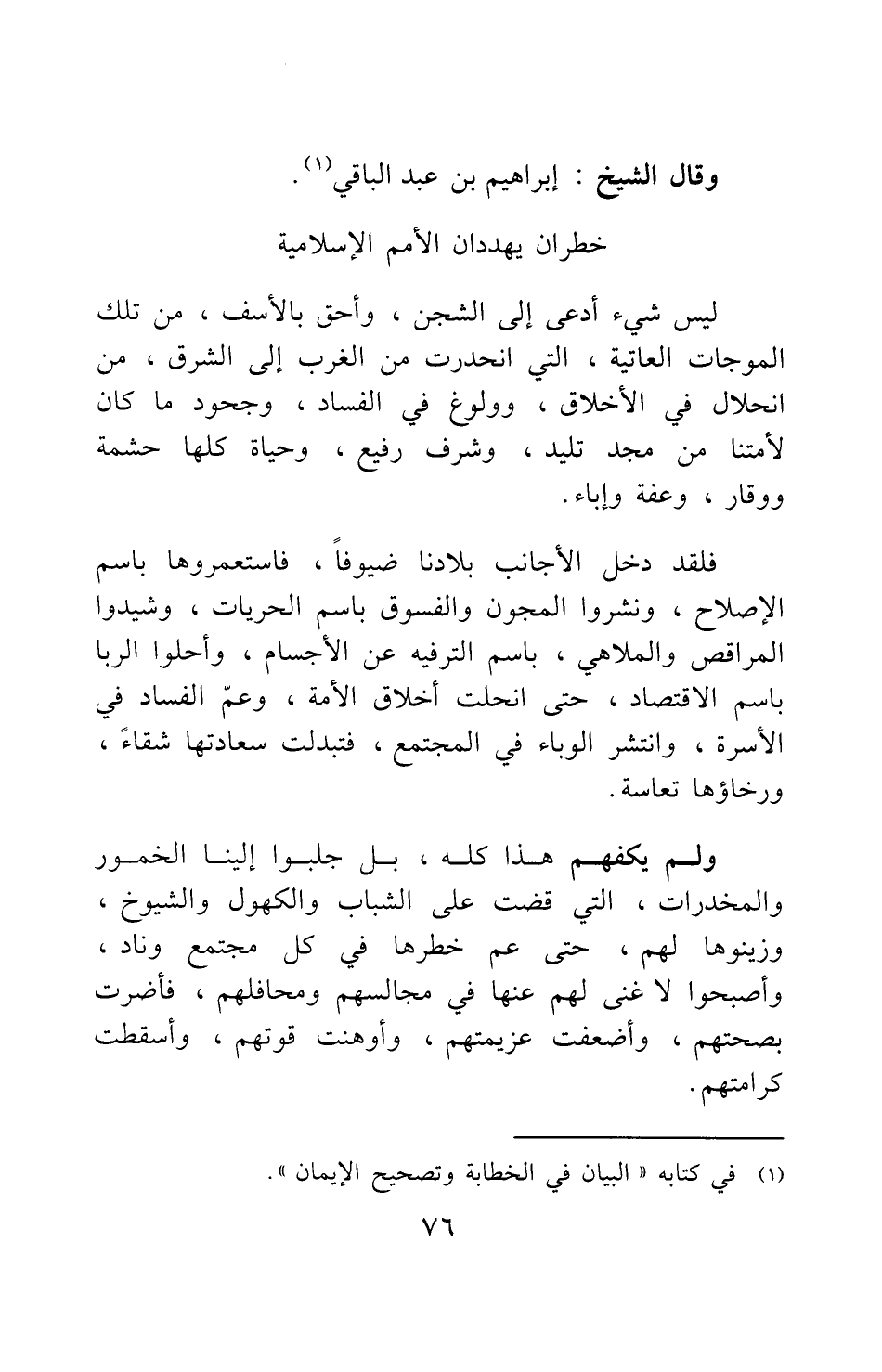 [قول الشيخ إبراهيم بن عبد الباقي 1 خطران يهددان الأمم الإسلامية]