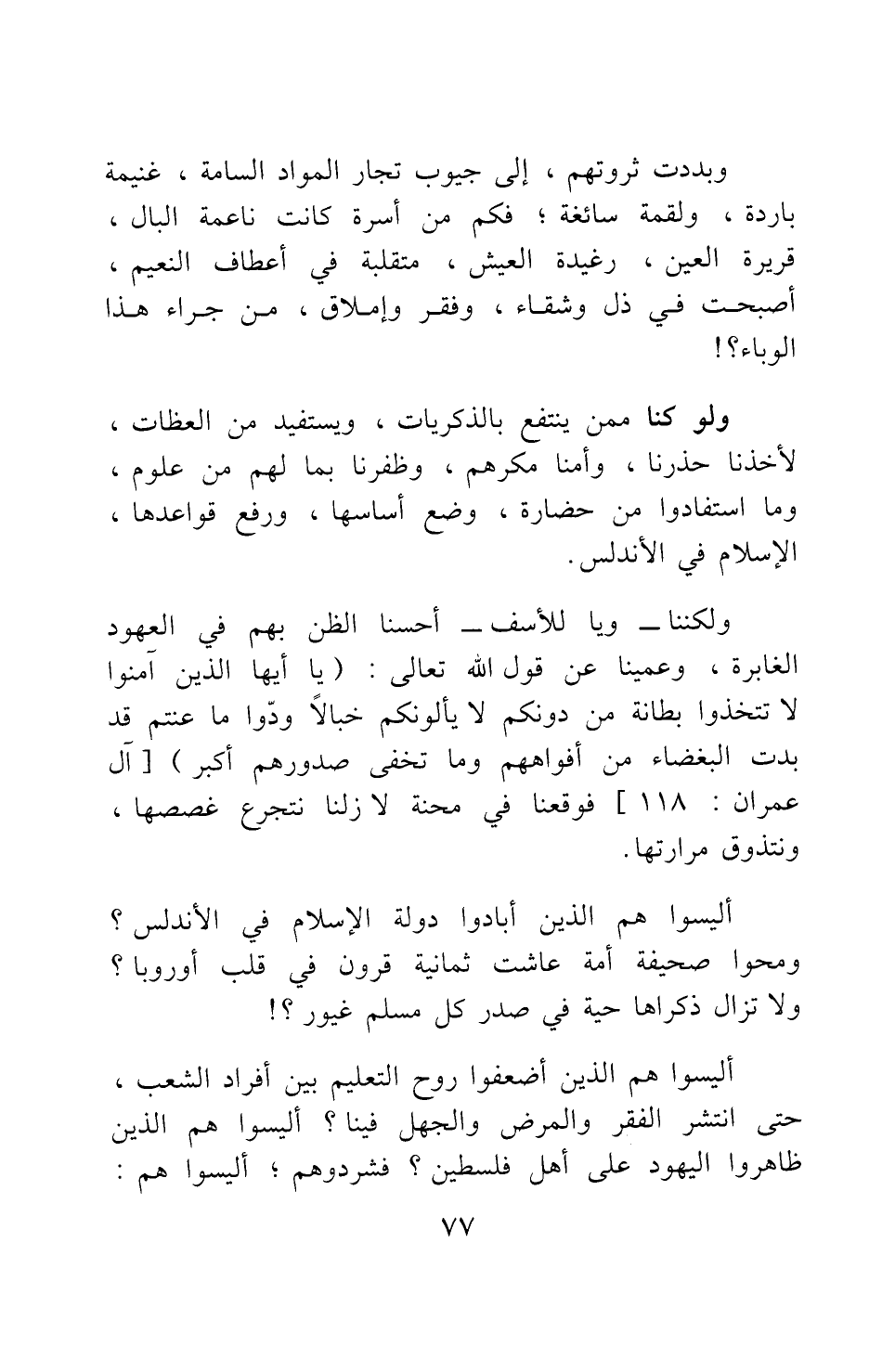 أليسوا هم الذين أبادوا دولة الإسلام في الأندلس؟ ومحوا صحيفة أمة عاشت ثمانية قرون في قلب أوروبا؟ ولا تزال ذكراها حية في صدر كل مسلم غيور. أليسوا هم الذين أضعفوا روح التعليم بين أفراد الشعب، حتى انتشر الفقر والمرض والجهل فينا؟ أليسوا هم الذين ظاهروا اليهود على أهل فلسطين فشردوهم أليسوا هم