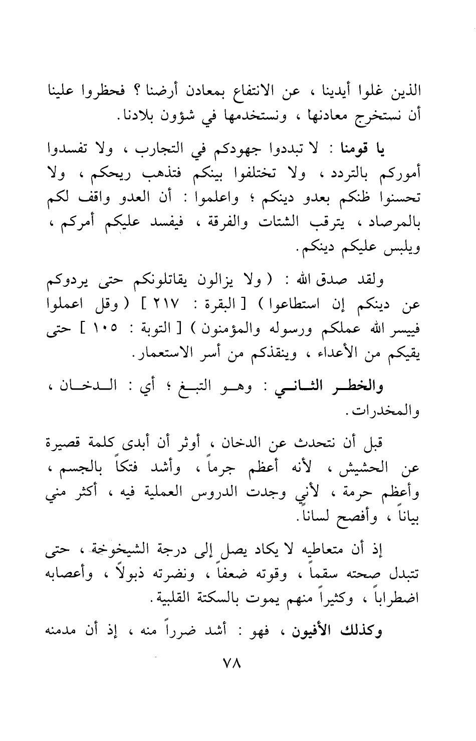والخطر الثاني: وهو التبغ، أي: الدخان، والمخدرات.