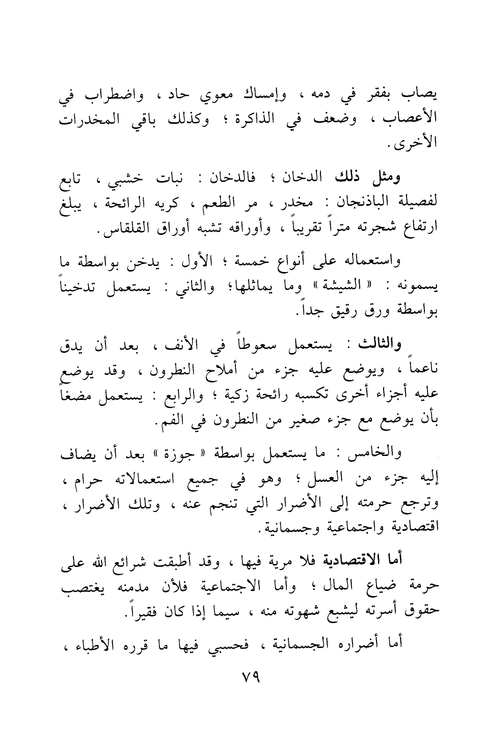أما الاقتصادية فلا مرية فيها؛ وقد أطبقت شرائع الله على حرمة ضياع المال. وأما الاجتماعية فلأن مدمنه يغتصب حقوق أسرته ليشبع شهوته منه، سيما إذا كان فقيرا. أما أضراره الجسمانية، فحسبي فيها ما قرره الأطباء،