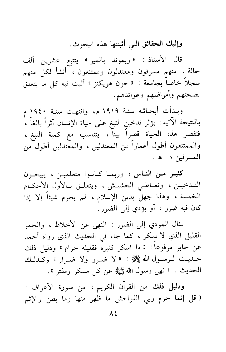 وبدأت أبحاثه سنة 1919 م، وانتهت سنة 1945 م بالنتيجة الآتية: يؤثر تدخين التبغ على حياة الإنسان أثرا بالغا، فتقصر هذه الحياة قصرا بينا، يتناسب مع كمية التبغ، والممتنعون أطول أعمارا من المعتدلين، والمعتدلين أطول من المسرفين اهـ. كثير من الناس، وربما كانوا متعلمين، يبيحون التدخين، وتعاطي الحشيش، ويتعلق بالأول الأحكام الخمسة، وهذا جهل بدين الإسلام، لم يحرم شيئا إلا إذا كان فيه ضرر، أو يؤدي إلى الضرر.