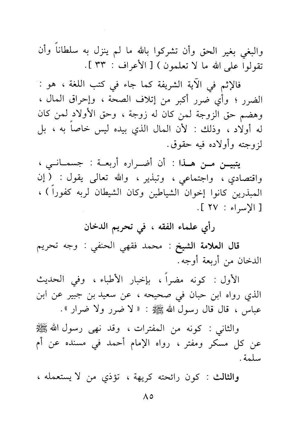 يتبين من هذا أن أضراره أربعة: جسماني، واقتصادي، واجتماعي، وتبذير، والله تعالى يقول: {إِنَّ الْمُبَذِّرِينَ كَانُوا إِخْوَانَ الشَّيَاطِينِ وَكَانَ الشَّيْطَانُ لِرَبِّهِ كَفُوراً} [سورة الإسراء آية: 27] .