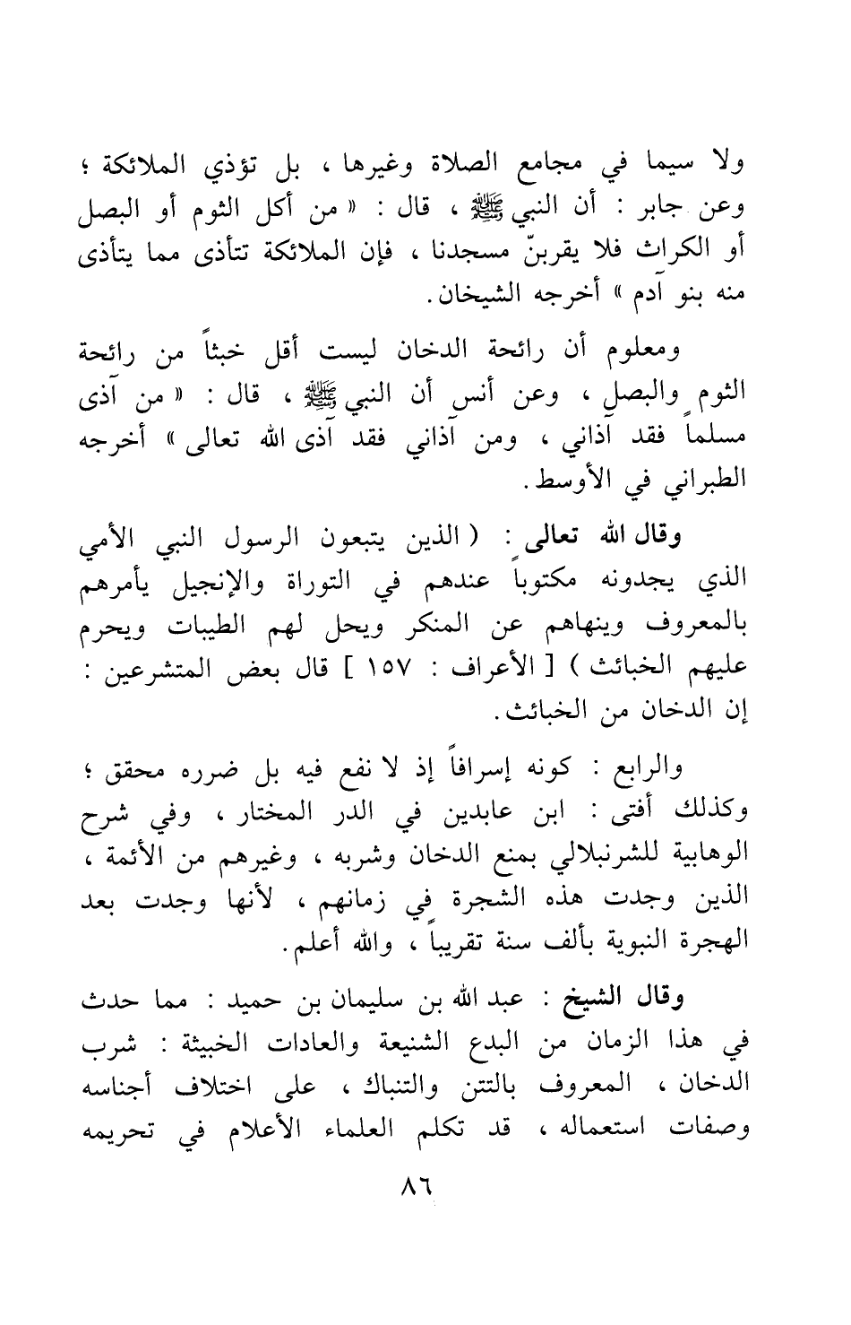 وقال الشيخ: عبد الله بن سليمان بن حميد: مما حدث في هذا الزمان من البدع الشنيعة والعادات الخبيثة: شرب الدخان، المعروف بالتتن والتنباك، على اختلاف أجناسه وصفات استعماله؛ قد تكلم العلماء الأعلام في تحريمه