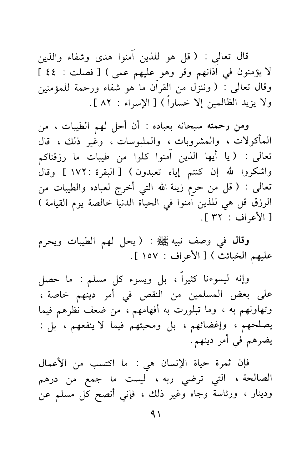 وإنه ليسوؤنا كثيرا، بل ويسوء كل مسلم: ما حصل على بعض المسلمين من النقص في أمر دينهم خاصة، وتهاونهم به، وما تبلورت به أفهامهم، من ضعف نظرهم فيما يصلحهم، وإغضائهم، بل ومحبتهم فيما لا ينفعهم، بل يضرهم في أمر دينهم. فإن ثمرة حياة الإنسان هي ما اكتسب من الأعمال الصالحة التي ترضي ربه، ليست ما جمع من درهم ودينار، ورئاسة وجاه وغير ذلك؛ فإني أنصح كل مسلم عن
