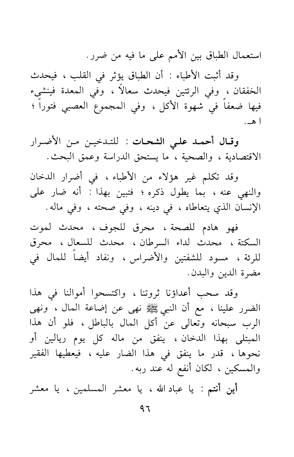 وقد سحب أعداؤنا ثروتنا، واكتسحوا أموالنا في هذا الضرر علينا، مع أن النبي صلى الله عليه وسلم نهى عن إضاعة المال، ونهى الرب سبحانه وتعالى عن أكل المال بالباطل، فلو أن هذا المبتلى بهذا الدخان، ينفق من ماله كل يوم ريالين أو نحوها، قدر ما ينفق في هذا الضار عليه، فيعطيها الفقير والمسكين، لكان أنفع له عند ربه. أين أنتم يا عباد الله! يا معشر المسلمين! يا معشر