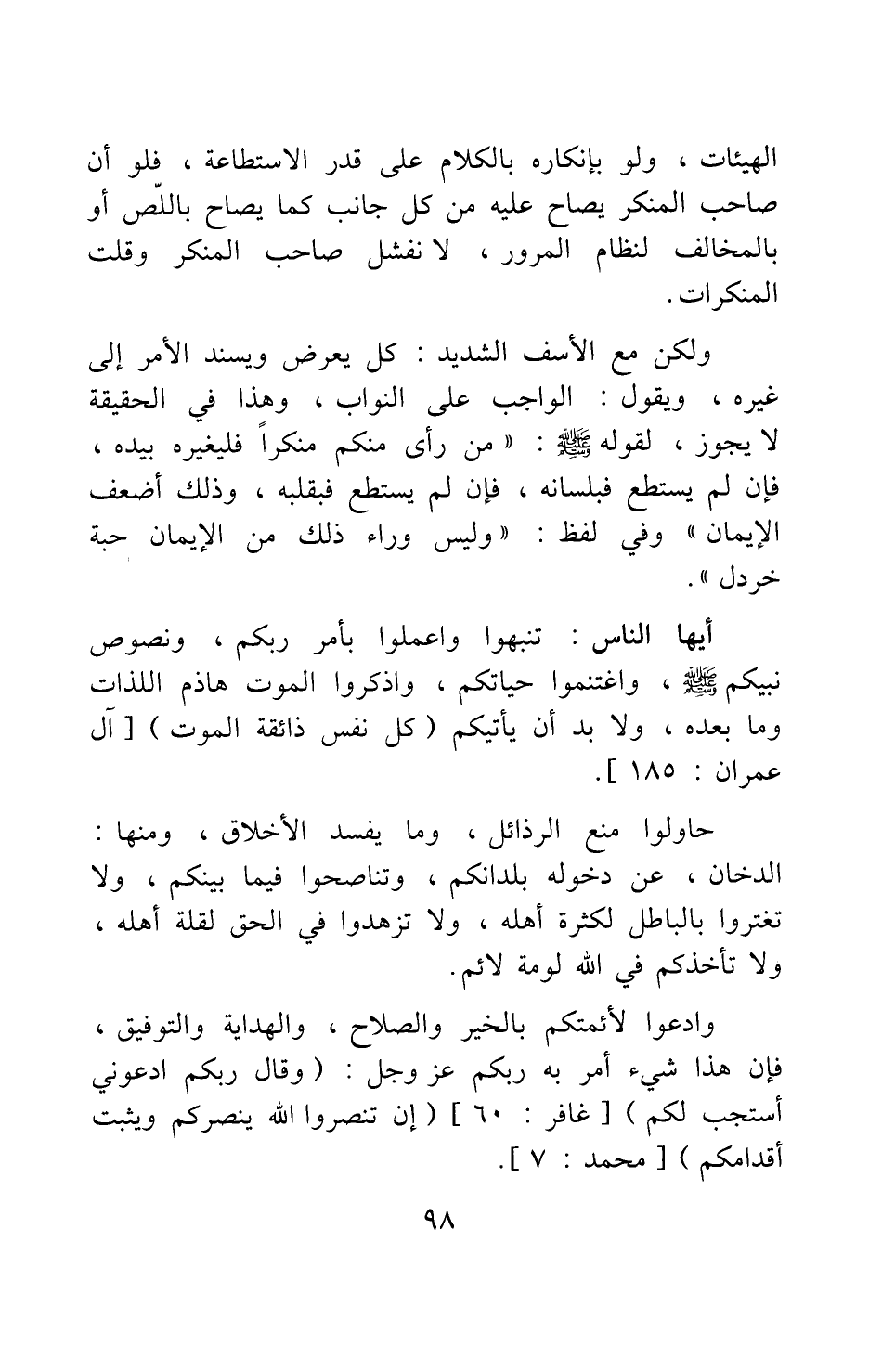 أيها الناس، تنبهوا واعملوا بأمر ربكم، ونصوص نبيكم صلى الله عليه وسلم؛ واغتنموا حياتكم، واذكروا الموت هادم اللذات وما بعده، ولا بد أن يأتيكم، {كُلُّ نَفْسٍ ذَائِقَةُ الْمَوْتِ} [سورة آل عمران آية: 185] . حاولوا منع الرذائل، وما يفسد الأخلاق، ومنها: الدخان، عن دخوله بلدانكم، وتناصحوا فيما بينكم، ولا تغتروا بالباطل لكثرة أهله، ولا تزهدوا في الحق لقلة أهله، ولا تأخذكم في الله لومة لائم.