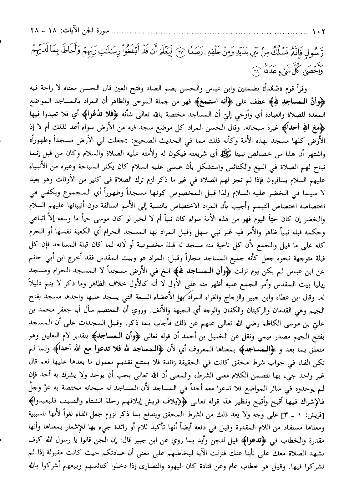 وقرأ قوم «صعدا» بضمتين وابن عباس والحسن بضم الصاد وفتح العين قال الحسن معناه لا راحة فيه وَأَنَّ الْمَساجِدَ لِلَّهِ عطف على أَنَّهُ اسْتَمَعَ فهو من جملة الموحى والظاهر أن المراد بالمساجد المواضع المعدة للصلاة والعبادة أي وأوحي إليّ أن المساجد مختصة بالله تعالى شأنه فَلا تَدْعُوا أي فلا تعبدوا فيها مَعَ اللَّهِ أَحَداً غيره سبحانه. وقال الحسن المراد كل موضع سجد فيه من الأرض سواء أعد لذلك أم لا إذ الأرض كلها مسجد لهذه الأمة وكأنه ذلك مما
