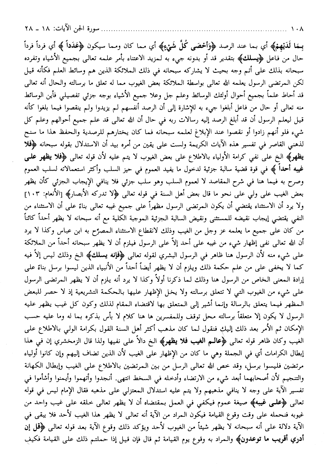 بكرامة الولي بالاطلاع على الغيب وكان ظاهر قوله تعالى عالِمُ الْغَيْبِ فَلا يُظْهِرُ إلخ دالا على نفيها ولذا قال الزمخشري إن في هذا إبطال الكرامات أي في الجملة وهي ما كان من الإظهار على الغيب لأن الذين تضاف إليهم وإن كانوا أولياء مرتضين فليسوا برسل، وقد خص الله تعالى الرسل من بين المرتضين بالاطلاع على الغيب وإبطال الكهانة والتنجيم لأن أصحابهما أبعد شيء من الارتضاء وأدخله في السخط انتهى. أنجدوا وأتهموا وأيمنوا وأشأموا في تفسير الآية على وجه لا ينافي مذهبهم ولا يتم عليه استدلال المعتزلي على مذهبه فقال الإمام ليس في قوله تعالى عَلى غَيْبِهِ صيغة عموم فيكفي في العمل بمقتضاه أن لا يظهر تعالى خلقه على غيب واحد من غيوبه فنحمله على وقت وقوع القيامة فيكون المراد من الآية أنه تعالى لا يظهر هذا الغيب لأحد فلا يبقى في الآية دلالة على أنه سبحانه لا يظهر شيئا من الغيوب لأحد ويؤكد ذلك وقوع الآية بعد قوله تعالى قُلْ إِنْ أَدْرِي أَقَرِيبٌ ما تُوعَدُونَ والمراد به وقوع يوم القيامة ثم قال فإن قيل إذا حملتم ذلك على القيامة فكيف