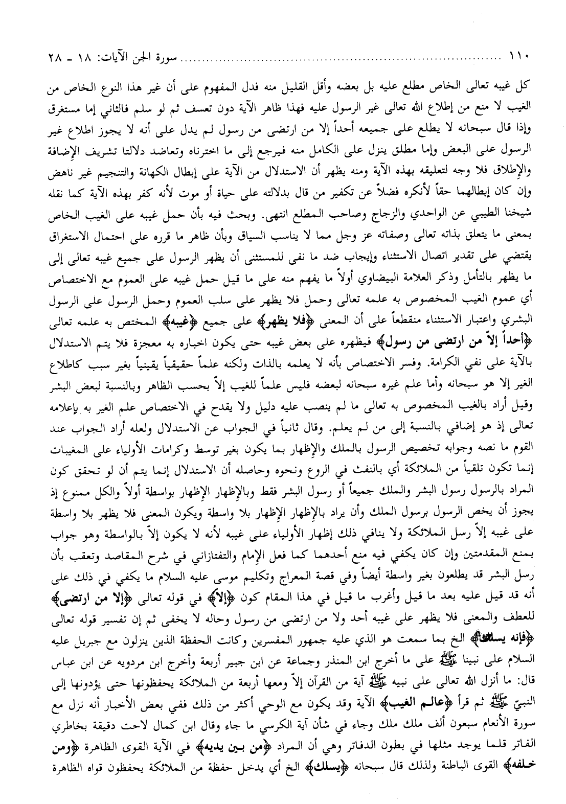 كل غيبه تعالى الخاص مطلع عليه بل بعضه وأقل القليل منه فدل المفهوم على أن غير هذا النوع الخاص من الغيب لا منع من إطلاع الله تعالى غير الرسول عليه فهذا ظاهر الآية دون تعسف ثم لو سلم فالثاني إما مستغرق وإذا قال سبحانه لا يطلع على جميعه أحدا إلا من ارتضى من رسول لم يدل على أنه لا يجوز اطلاع غير الرسول على البعض وإما مطلق ينزل على الكامل منه فيرجع إلى ما اخترناه وتعاضد دلالتا تشريف الإضافة والإطلاق فلا وجه لتعليقه بهذه الآية ومنه يظهر أن الاستدلال من الآية على إبطال الكهانة والتنجيم غير ناهض وإن كان إبطالهما حقا لأنكره فضلا عن تكفير من قال بدلالته على حياة أو موت لأنه كفر بهذه الآية كما نقله شيخنا الطيبي عن الواحدي والزجاج وصاحب المطلع انتهى. وبحث فيه بأن حمل غيبه على الغيب الخاص بمعنى ما يتعلق بذاته تعالى وصفاته عز وجل مما لا يناسب السياق وبأن ظاهر ما قرره على احتمال الاستغراق يقتضي على تقدير اتصال الاستثناء وإيجاب ضد ما نفى للمستثنى أن يظهر الرسول على جميع غيبه تعالى إلى ما يظهر بالتأمل وذكر العلامة البيضاوي أولا ما يفهم منه على ما قيل حمل غيبه على العموم مع الاختصاص أي عموم الغيب المخصوص به علمه تعالى وحمل فلا يظهر على سلب العموم وحمل الرسول على الرسول البشري واعتبار الاستثناء منقطعا على أن المعنى فَلا يُظْهِرُ على جميع غَيْبِهِ المختص به علمه تعالى أَحَداً إِلَّا مَنِ ارْتَضى مِنْ رَسُولٍ فيظهره على بعض غيبه حتى يكون اخباره به معجزة فلا يتم الاستدلال بالآية على نفي الكرامة. وفسر الاختصاص بأنه لا يعلمه بالذات ولكنه علما حقيقيا يقينيا بغير سبب كاطلاع الغير إلا هو سبحانه وأما علم غيره سبحانه لبعضه فليس علما للغيب إلّا بحسب الظاهر