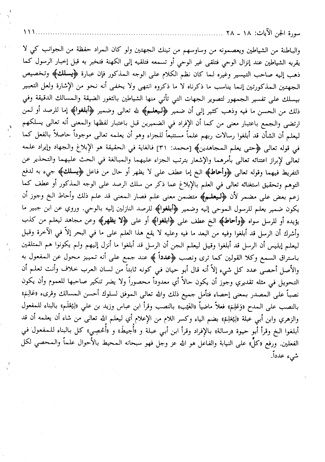 والباطنة من الشياطين ويعصمونه من وساوسهم من تينك الجهتين ولو كان المراد حفظة من الجوانب كي لا يقربه الشياطين عند إنزال الوحي فتلقى غير الوحي أو تسمعه فتلقيه إلى الكهنة فتخبر به قبل إخبار الرسول كما ذهب إليه صاحب التيسير وغيره لما كان نظم الكلام على الوجه المذكور فإن عبارة يَسْلُكُ وتخصيص الجهتين المذكورتين إنما يناسب ما ذكرناه لا ما ذكروه انتهى ولا يخفى أنه نحو من الإشارة ولعل التعبير بيسلك على تفسير الجمهور لتصوير الجهات التي تأتي منها الشياطين بالثغور الضيقة والمسالك الدقيقة وفي ذلك من الحسن ما فيه وذهب كثير إلى أن ضمير لِيَعْلَمَ لله تعالى وضمير أَبْلَغُوا إما للرصد أو لمن ارتضى والجمع باعتبار معنى من كما أن الإفراد في الضميرين قبل باعتبار لفظها والمعنى أنه تعالى يسلكهم ليعلم أن الشأن قد أبلغوا رسالات ربهم علما مستتبعا للجزاء وهو أن يعلمه تعالى موجودا حاصلا بالفعل كما في قوله تعالى حَتَّى نَعْلَمَ الْمُجاهِدِينَ [محمد: 31] فالغاية في الحقيقة هو الإبلاغ والجهاد وإيراد علمه تعالى لإبراز اعتنائه تعالى بأمرهما والإشعار بترتب الجزاء عليهما والمبالغة في الحث عليهما والتحذير عن التفريط فيهما وقوله تعالى وَأَحاطَ إلخ إما عطف على لا يظهر أو حال من فاعل يَسْلُكُ جيء به لدفع التوهم وتحقيق استغنائه تعالى في العلم بالإبلاغ عما ذكر من سلك الرصد على الوجه المذكور أو عطف كما زعم بعض على مضمر لأن لِيَعْلَمَ متضمن معنى علم فصار المعنى قد علم ذلك وأحاط إلخ وجوز أن يكون ضمير يعلم للرسول الموحى إليه وضمير أَبْلَغُوا للرصد النازلين إليه بالوحي. وروي عن ابن جبير ما يؤيده أو للرسل سواه وَأَحاطَ إلخ عطف على أَبْلَغُوا أو على لا يُظْهِرُ وعن مجاهد ليعلم من كذب وأشرك أن الرسل قد أبلغوا وفيه من البعد ما فيه وعليه لا يقع هذا العلم على ما في البحر إلّا في الآخرة وقيل ليعلم إبليس