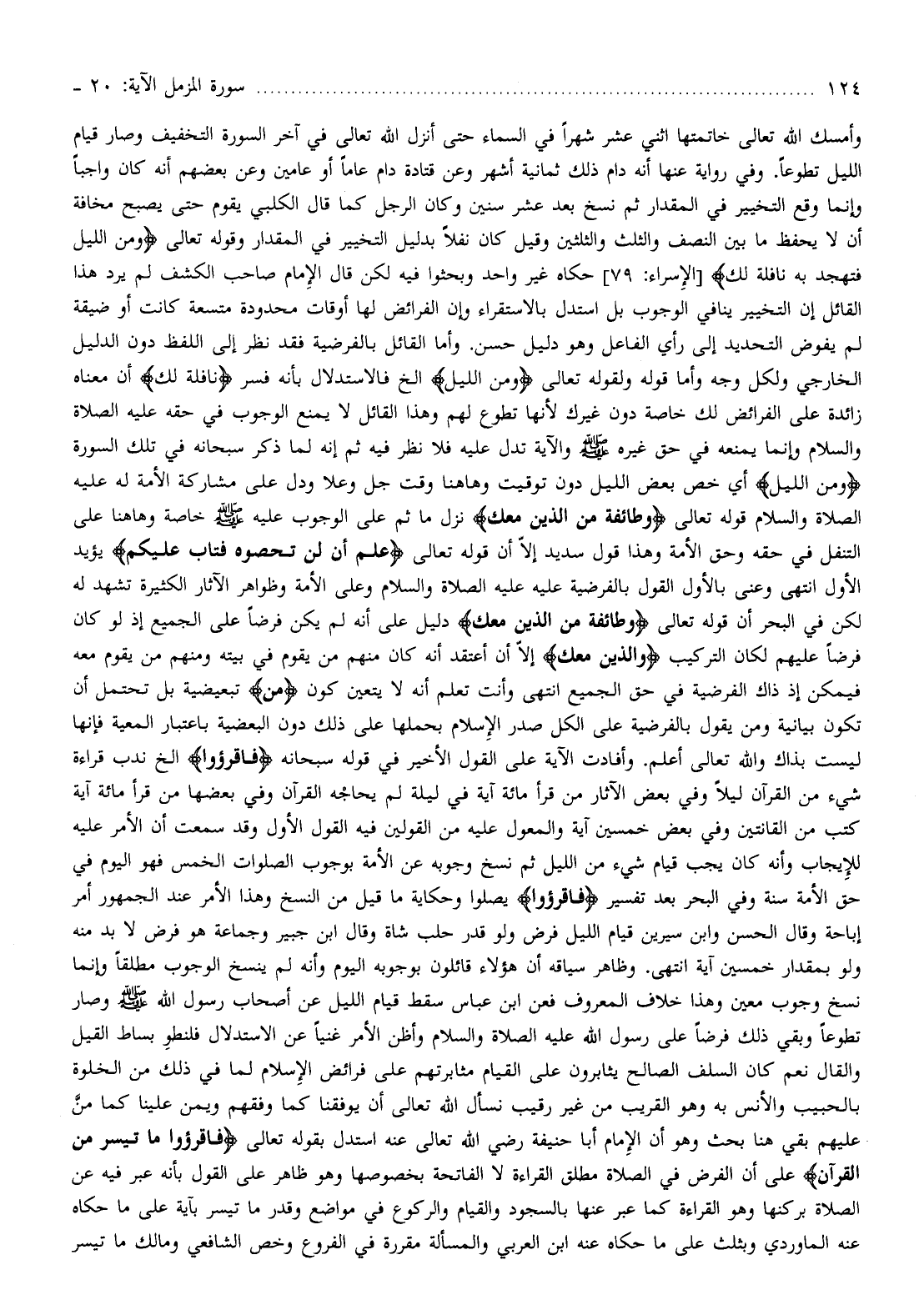 . وفي رواية عنها أنه دام ذلك ثمانية أشهر وعن قتادة دام عاما أو عامين وعن بعضهم أنه كان واجبا وإنما وقع التخيير في المقدار ثم نسخ بعد عشر سنين وكان الرجل كما قال الكلبي يقوم حتى يصبح مخافة أن لا يحفظ ما بين النصف والثلث والثلثين وقيل كان نفلا بدليل التخيير في المقدار وقوله تعالى وَمِنَ اللَّيْلِ فَتَهَجَّدْ بِهِ نافِلَةً لَكَ [الإسراء: 79] حكاه غير واحد وبحثوا فيه لكن قال الإمام صاحب الكشف لم يرد هذا القائل إن التخيير ينافي الوجوب بل استدل بالاستقراء وإن الفرائض لها أوقات محدودة متسعة كانت أو ضيقة لم يفوض التحديد إلى رأي الفاعل وهو دليل حسن. وأما القائل بالفرضية فقد نظر إلى اللفظ دون الدليل الخارجي ولكل وجه وأما قوله ولقوله تعالى وَمِنَ اللَّيْلِ إلخ فالاستدلال بأنه فسر نافِلَةً لَكَ أن معناه زائدة على الفرائض لك خاصة دون غيرك لأنها تطوع لهم وهذا القائل لا يمنع الوجوب في حقه عليه الصلاة والسلام وإنما يمنعه في حق غيره صلّى الله عليه وسلم والآية تدل عليه فلا نظر فيه ثم إنه لما ذكر سبحانه في تلك السورة وَمِنَ اللَّيْلِ أي خص بعض الليل دون توقيت وهاهنا وقت جل وعلا ودل على مشاركة الأمة له عليه الصلاة والسلام قوله تعالى وَطائِفَةٌ مِنَ الَّذِينَ مَعَكَ نزل ما ثم على الوجوب عليه صلّى الله عليه وسلم خاصة وهاهنا على التنفل في حقه وحق الأمة وهذا قول سديد إلّا أن قوله تعالى عَلِمَ أَنْ لَنْ تُحْصُوهُ فَتابَ عَلَيْكُمْ يؤيد الأول انتهى وعنى بالأول القول بالفرضية عليه عليه الصلاة والسلام وعلى الأمة وظواهر الآثار الكثيرة تشهد له لكن في البحر أن قوله تعالى وَطائِفَةٌ مِنَ الَّذِينَ مَعَكَ دليل على أنه لم يكن فرضا على الجميع إذ لو كان فرضا عليهم لكان التركيب (والَّذِينَ مَعَكَ) إلّا أن أعتقد أنه كان منهم من يقوم في بيته ومنهم من يقوم معه فيمكن إذ ذاك الفرضية في حق الجميع انتهى وأنت تعلم أنه لا يتعين كون مِنْ تبعيضية بل تحتمل أن تكون بيانية ومن يقول بالفرضية على الكل صدر الإسلام بحملها على ذلك دون البعضية باعتبار المعية فإنها ليست بذاك والله تعالى أعلم. وأفادت الآية على القول الأخير في قوله سبحانه فَاقْرَؤُا إلخ ندب قراءة شيء من القرآن ليلا وفي بعض الآثار من قرأ مائة آية في ليلة لم يحاجه القرآن وفي بعضها من قرأ مائة آية كتب من القانتين وفي بعض خمسين آية والمعول عليه من القولين فيه القول الأول وقد سمعت أن الأمر عليه للإيجاب وأنه كان يجب قيام شيء من الليل ثم نسخ وجوبه عن الأمة بوجوب الصلوات الخمس فهو اليوم في حق الأمة سنة وفي البحر بعد تفسير فَاقْرَؤُا يصلوا وحكاية ما قيل من النسخ وهذا الأمر عند الجمهور أمر إباحة وقال الحسن وابن سيرين قيام الليل فرض ولو قدر حلب شاة وقال ابن جبير وجماعة هو فرض لا بد منه ولو بمقدار خمسين آية انتهى. وظاهر سياقه أن هؤلاء قائلون بوجوبه اليوم وأنه لم ينسخ الوجوب مطلقا وإنما نسخ وجوب معين وهذا خلاف المعروف فعن ابن عباس سقط قيام الليل عن أصحاب رسول الله صلّى الله عليه وسلم وصار تطوعا وبقي ذلك فرضا على رسول الله عليه الصلاة والسلام وأظن الأمر غنيا عن الاستدلال فلنطو بساط القيل والقال نعم كان السلف الصالح يثابرون على القيام مثابرتهم على فرائض الإسلام لما في ذلك من الخلوة بالحبيب والأنس به وهو القريب من غير رقيب نسأل الله تعالى أن يوفقنا كما وفقهم ويمن علينا كما منّ عليهم بقي هنا بحث وهو أن الإمام أبا حنيفة رضي الله تعالى عنه استدل بقوله تعالى فَاقْرَؤُا ما تَيَسَّرَ مِنَ الْقُرْآنِ على أن الفرض في الصلاة مطلق القراءة لا الفاتحة بخصوصها وهو ظاهر على القول بأنه عبر فيه عن الصلاة بركنها وهو القراءة كما عبر عنها بالسجود والقيام والركوع في مواضع وقدر ما تيسر بآية على ما حكاه عنه الماوردي وبثلث على ما حكاه عنه ابن العربي والمسألة مقررة في الفروع وخص الشافعي ومالك ما تيسر
