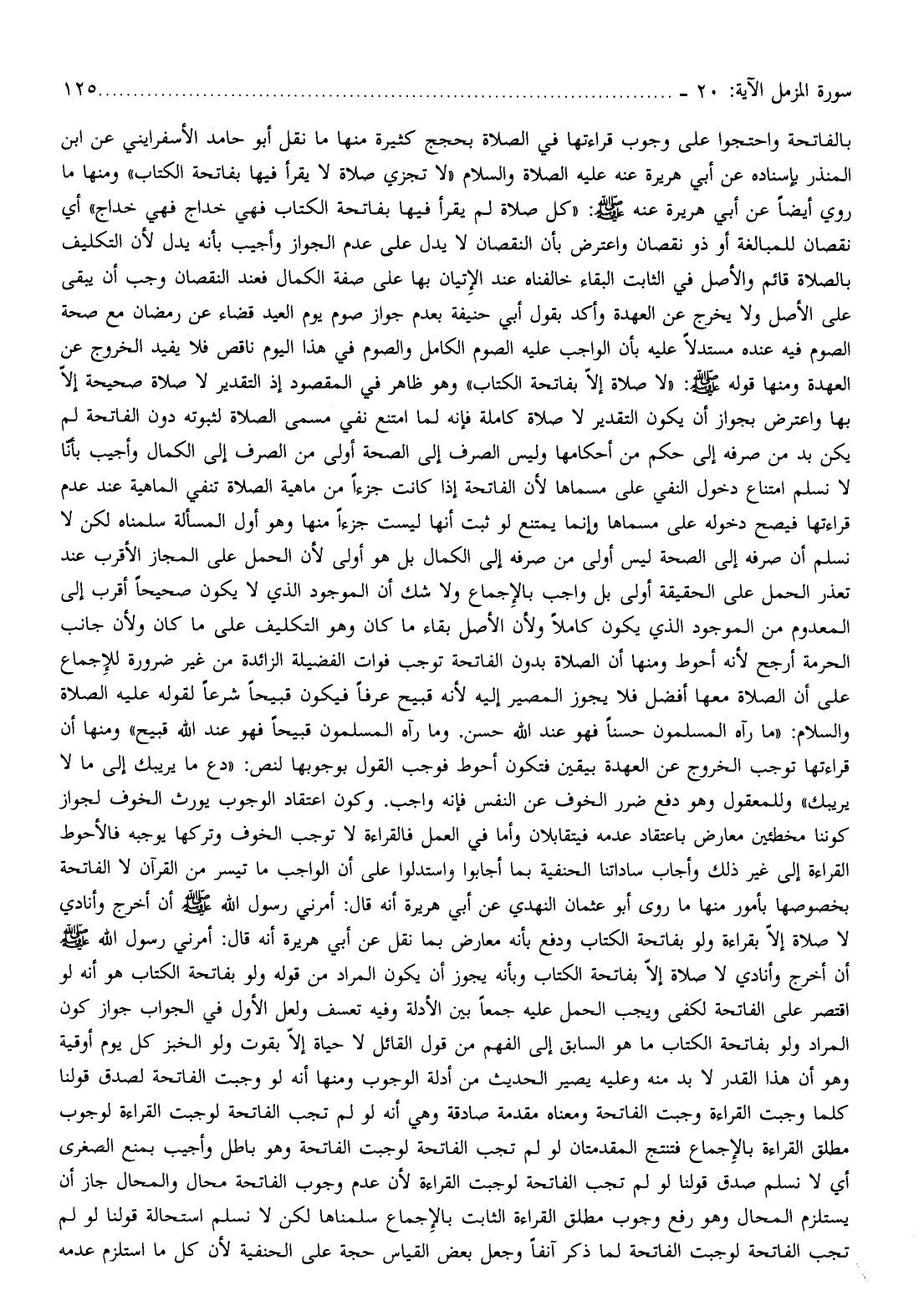 وللمعقول وهو دفع ضرر الخوف عن النفس فإنه واجب. وكون اعتقاد الوجوب يورث الخوف لجواز كوننا مخطئين معارض باعتقاد عدمه فيتقابلان وأما في العمل فالقراءة لا توجب الخوف وتركها يوجبه فالأحوط القراءة إلى غير ذلك وأجاب ساداتنا الحنفية بما أجابوا واستدلوا على أن الواجب ما تيسر من القرآن لا الفاتحة بخصوصها بأمور منها ما