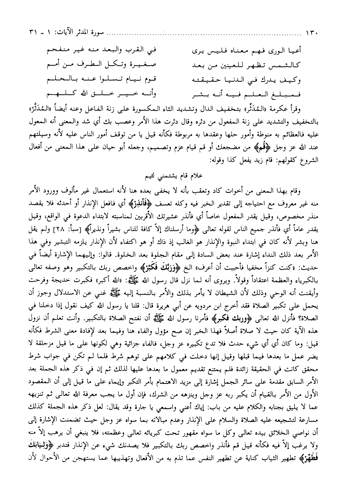 وقرأ عكرمة «المدثّر» بتخفيف الدال وتشديد الثاء المكسورة على زنة الفاعل وعنه أيضا «المدثّر» بالتخفيف والتشديد على زنة المفعول من دثره وقال دثرت هذا الأمر وعصب بك أي شد والمعنى أنه المعول عليه فالعظائم به منوطة وأمور حلها وعقدها به مربوطة فكأنه قيل يا من توقف أمور الناس عليه لأنه وسيلتهم عند الله عز وجل قُمْ من مضجعك أو قم قيام عزم وتصميم، وجعله أبو حيان على هذا المعنى من أفعال الشروع كقولهم: قام زيد يفعل كذا وقوله: