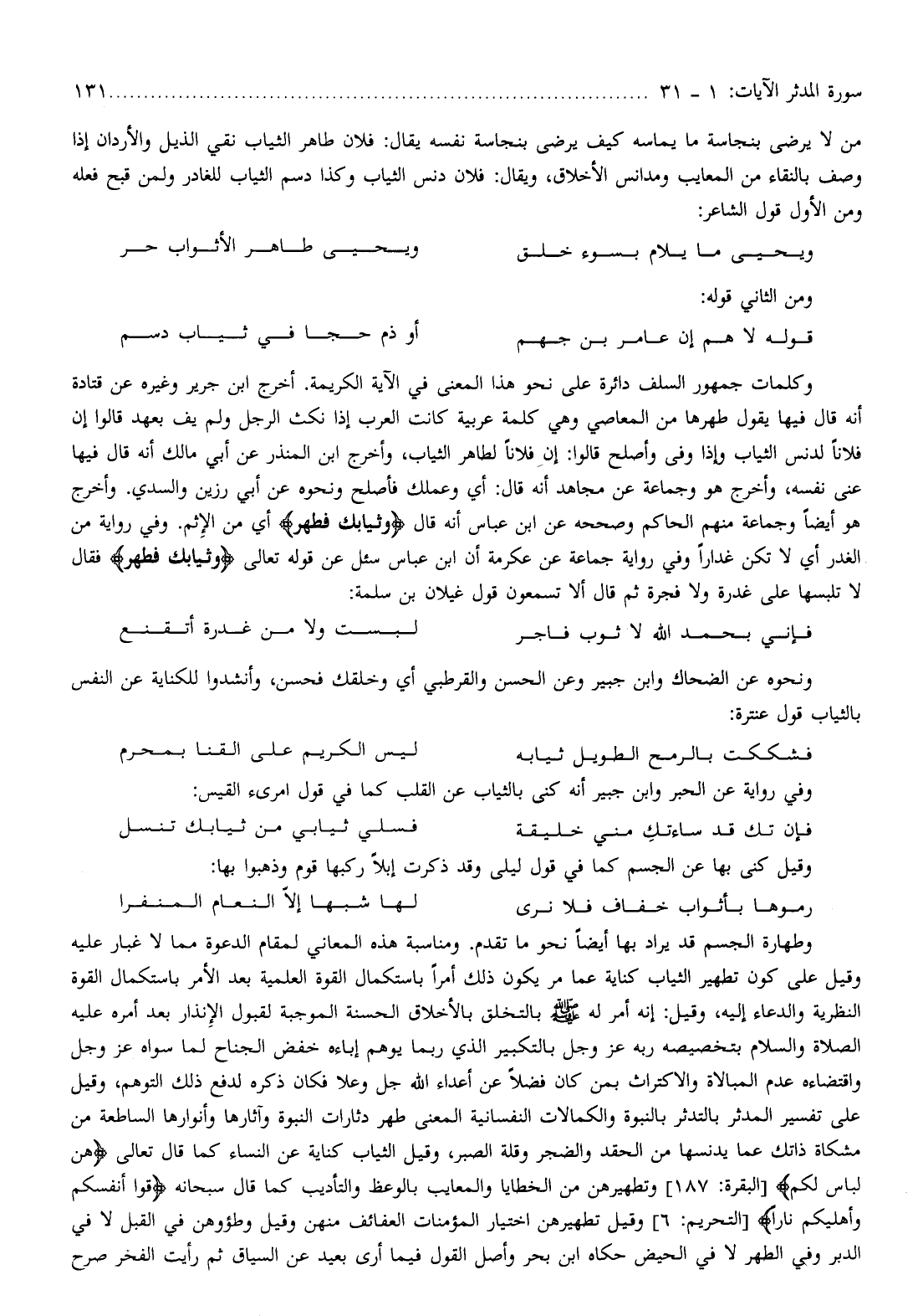 وكلمات جمهور السلف دائرة على نحو هذا المعنى في الآية الكريمة. أخرج ابن جرير وغيره عن قتادة أنه قال فيها يقول طهرها من المعاصي وهي كلمة عربية كانت العرب إذا نكث الرجل ولم يف بعهد قالوا إن فلانا لدنس الثياب وإذا وفى وأصلح قالوا: إن فلانا لطاهر الثياب، وأخرج ابن المنذر عن أبي مالك أنه قال فيها عنى نفسه، وأخرج هو وجماعة عن مجاهد أنه قال: أي وعملك فأصلح ونحوه عن أبي رزين والسدي. وأخرج هو أيضا وجماعة منهم الحاكم وصححه عن ابن عباس أنه قال وَثِيابَكَ فَطَهِّرْ أي من الإثم. وفي رواية من الغدر أي لا تكن غدارا وفي رواية جماعة عن عكرمة أن ابن عباس سئل عن قوله تعالى وَثِيابَكَ فَطَهِّرْ فقال لا تلبسها على غدرة ولا فجرة ثم قال ألا تسمعون قول غيلان بن سلمة: