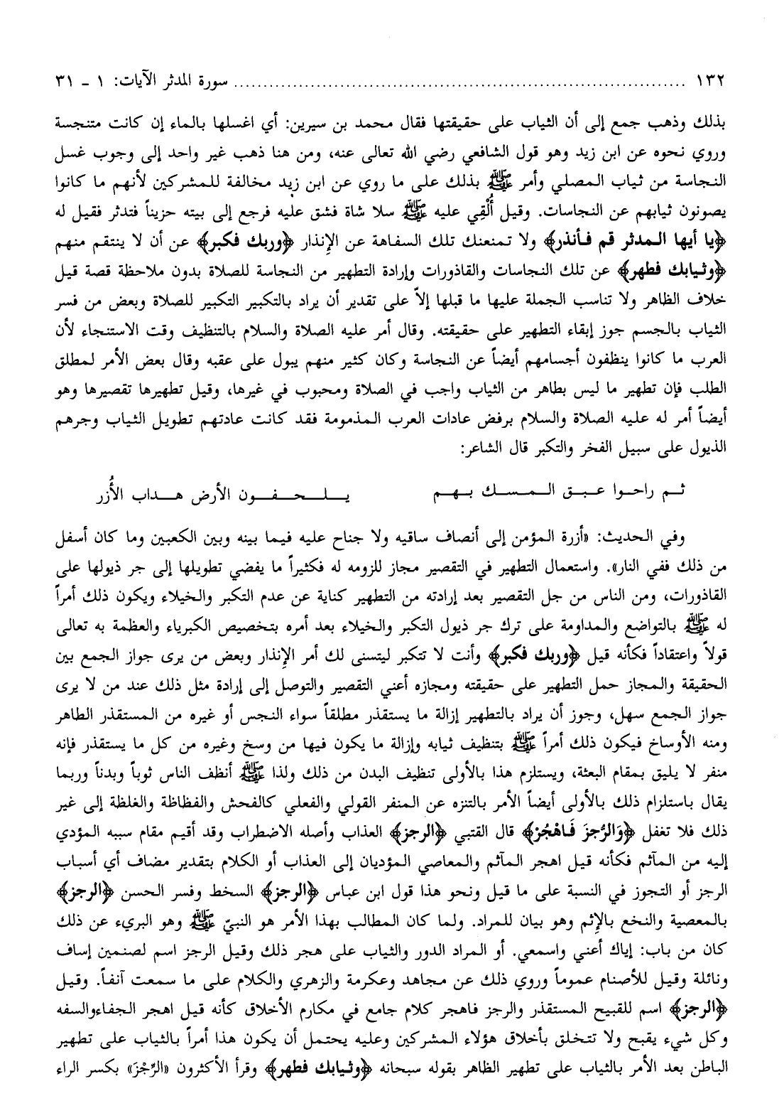 بذلك وذهب جمع إلى أن الثياب على حقيقتها فقال محمد بن سيرين: أي اغسلها بالماء إن كانت متنجسة وروي نحوه عن ابن زيد وهو قول الشافعي رضي الله تعالى عنه، ومن هنا ذهب غير واحد إلى وجوب غسل النجاسة من ثياب المصلي وأمر صلّى الله عليه وسلم بذلك على ما روي عن ابن زيد مخالفة للمشركين لأنهم ما كانوا يصونون ثيابهم عن النجاسات. وقيل ألقي عليه صلّى الله عليه وسلم سلا شاة فشق عليه فرجع إلى بيته حزينا فتدثر فقيل له يا أَيُّهَا الْمُدَّثِّرُ قُمْ فَأَنْذِرْ ولا تمنعنك تلك السفاهة عن الإنذار وَرَبَّكَ فَكَبِّرْ عن أن لا ينتقم منهم وَثِيابَكَ فَطَهِّرْ عن تلك النجاسات والقاذورات وإرادة التطهير من النجاسة للصلاة بدون ملاحظة قصة قيل خلاف الظاهر ولا تناسب الجملة عليها ما قبلها إلّا على تقدير أن يراد بالتكبير التكبير للصلاة وبعض من فسر الثياب بالجسم جوز إبقاء التطهير على حقيقته. وقال أمر عليه الصلاة والسلام بالتنظيف وقت الاستنجاء لأن العرب ما كانوا ينظفون أجسامهم أيضا عن النجاسة وكان كثير منهم يبول على عقبه وقال بعض الأمر لمطلق الطلب فإن تطهير ما ليس بطاهر من الثياب واجب في الصلاة ومحبوب في غيرها، وقيل تطهيرها تقصيرها وهو أيضا أمر له عليه الصلاة والسلام برفض عادات العرب المذمومة فقد كانت عادتهم تطويل الثياب وجرهم الذيول على سبيل الفخر والتكبر قال الشاعر: