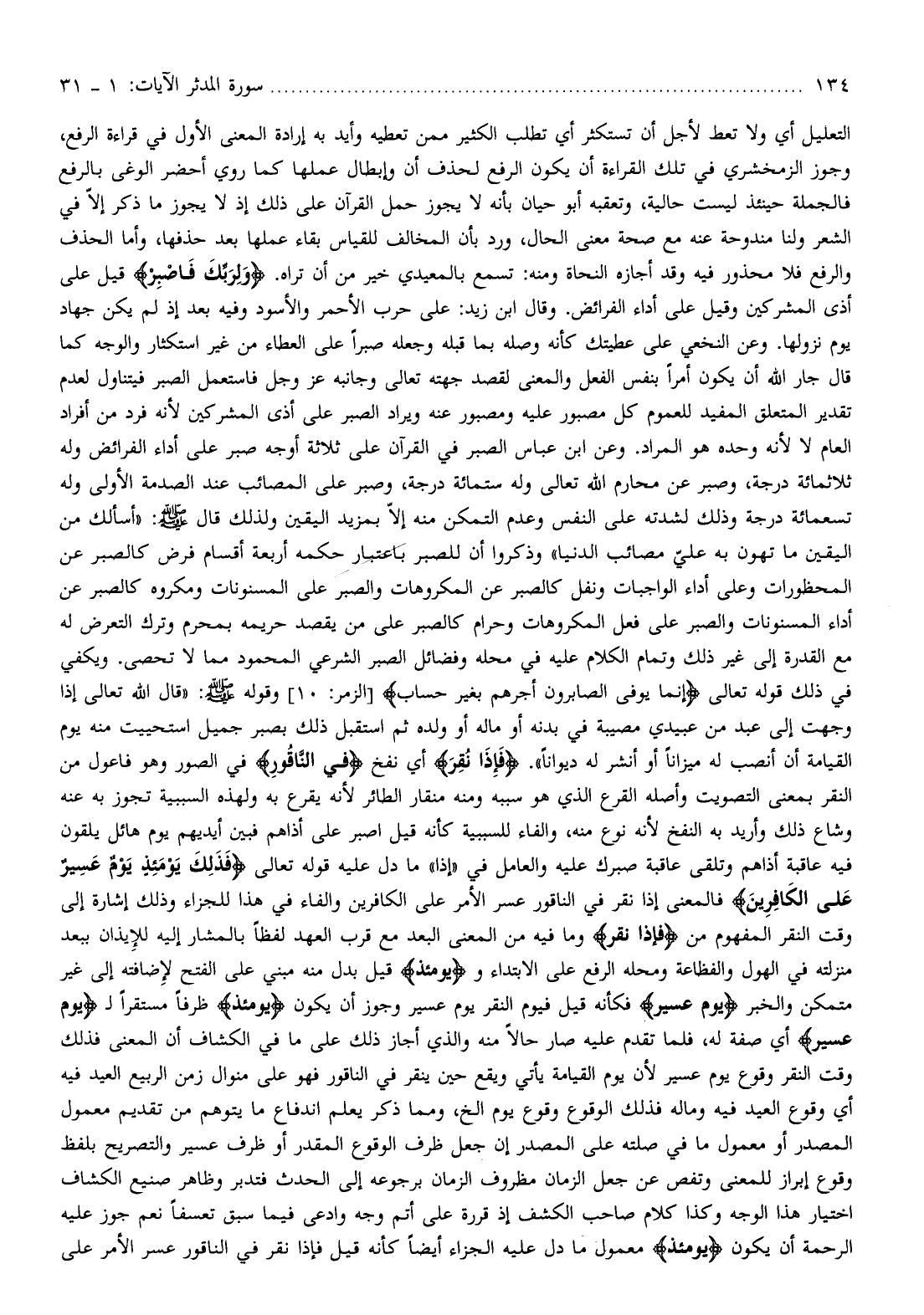 التعليل أي ولا تعط لأجل أن تستكثر أي تطلب الكثير ممن تعطيه وأيد به إرادة المعنى الأول في قراءة الرفع، وجوز الزمخشري في تلك القراءة أن يكون الرفع لحذف أن وإبطال عملها كما روي أحضر الوغى بالرفع فالجملة حينئذ ليست حالية، وتعقبه أبو حيان بأنه لا يجوز حمل القرآن على ذلك إذ لا يجوز ما ذكر إلّا في الشعر ولنا مندوحة عنه مع صحة معنى الحال، ورد بأن المخالف للقياس بقاء عملها بعد حذفها، وأما الحذف والرفع فلا محذور فيه وقد أجازه النحاة ومنه: تسمع بالمعيدي خير من أن تراه. وَلِرَبِّكَ فَاصْبِرْ قيل على أذى المشركين وقيل على أداء الفرائض. وقال ابن زيد: على حرب الأحمر والأسود وفيه بعد إذ لم يكن جهاد يوم نزولها. وعن النخعي على عطيتك كأنه وصله بما قبله وجعله صبرا على العطاء من غير استكثار والوجه كما قال جار الله أن يكون أمرا بنفس الفعل والمعنى لقصد جهته تعالى وجانبه عز وجل فاستعمل الصبر فيتناول لعدم تقدير المتعلق المفيد للعموم كل مصبور عليه ومصبور عنه ويراد الصبر على أذى المشركين لأنه فرد من أفراد العام لا لأنه وحده هو المراد. وعن ابن عباس الصبر في القرآن على ثلاثة أوجه صبر على أداء الفرائض وله ثلاثمائة درجة، وصبر عن محارم الله تعالى وله ستمائة درجة، وصبر على المصائب عند الصدمة الأولى وله تسعمائة درجة وذلك لشدته على النفس وعدم التمكن منه إلّا بمزيد اليقين ولذلك