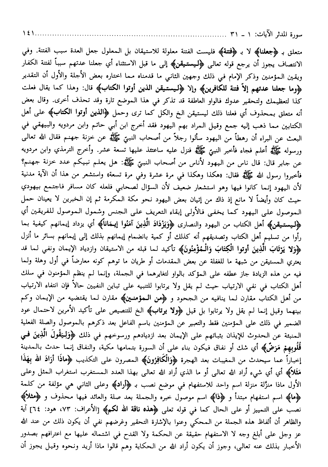 واستشعر من هذا أن الآية مدنية لأن اليهود إنما كانوا فيها وهو استشعار ضعيف لأن السؤال لصحابي فلعله كان مسافر فاجتمع بيهودي حيث كان وأيضا لا مانع إذ ذاك من إتيان بعض اليهود نحو مكة المكرمة ثم إن الخبرين لا يعينان حمل الموصول على اليهود كما يخفى فالأولى إبقاء التعريف على الجنس وشمول الموصول للفريقين أي لِيَسْتَيْقِنَ أهل الكتاب من اليهود والنصارى وَيَزْدادَ الَّذِينَ آمَنُوا إِيماناً أي يزداد إيمانهم كيفية بما رأوا من تسليم أهل الكتاب وتصديقهم أنه كذلك أو كمية بانضمام إيمانهم بذلك إلى إيمانهم بسائر ما أنزل وَلا يَرْتابَ الَّذِينَ أُوتُوا الْكِتابَ وَالْمُؤْمِنُونَ تأكيد لما قبله من الاستيقان وازدياد الإيمان ونفي لما قد يعتري المستيقن من شبهة ما للغفلة عن بعض المقدمات أو طريان ما توهم كونه معارضا في أول وهلة ولما فيه من هذه الزيادة جاز عطفه على المؤكد بالواو لتغايرهما في الجملة، وإنما لم ينظم المؤمنون في سلك أهل الكتاب في نفي الارتياب حيث لم يقل ولا يرتابوا للتنبيه على تباين النفيين حالا فإن انتفاء الارتياب من أهل الكتاب مقارن لما ينافيه من الجحود ومن المؤمنين مقارن لما يقتضيه من الإيمان وكم بينهما وقيل إنما لم يقل ولا يرتابوا بل قيل وَلا يَرْتابَ إلخ للتنصيص على تأكيد الأمرين لاحتمال عود الضمير في ذلك على المؤمنين فقط والتعبير عن المؤمنين باسم الفاعل بعد ذكرهم بالموصول والصلة الفعلية المنبئة عن الحدوث للإيذان بثباتهم على الإيمان بعد ازديادهم ورسوخهم في ذلك وَلِيَقُولَ الَّذِينَ فِي قُلُوبِهِمْ مَرَضٌ أي شك أو نفاق فيكون بناء على أن السورة بتمامها مكية، والنفاق إنما حدث بالمدينة إخبارا عما سيحدث من المغيبات بعد الهجرة وَالْكافِرُونَ المصرون على التكذيب ماذا أَرادَ اللَّهُ بِهذا مَثَلًا أي أي شيء أراد الله تعالى أو ما الذي أراد الله تعالى بهذا العدد المستغرب استغراب المثل وعلى الأول ماذا منزّلة منزلة اسم واحد للاستفهام في موضع نصب ب أَرادَ وعلى الثاني هي مؤلفة من كلمة ما اسم استفهام مبتدأ وذا اسم موصول خبره والجملة بعد صلة والعائد فيها محذوف ومَثَلًا نصب على التمييز أو على الحال كما في قوله تعالى هذِهِ ناقَةُ اللَّهِ لَكُمْ [الأعراف: 73، هود: 64] آية والظاهر أن ألفاظ هذه الجملة من المحكي وعنوا بالإشارة التحقير وغرضهم نفي أن يكون ذلك من عند الله عز وجل على أبلغ وجه لا الاستفهام حقيقة عن الحكمة ولا القدح في اشتماله عليها مع اعترافهم بصدور الأخبار بذلك عنه تعالى، وجوز أن يكون أراد الله من الحكاية وهم قالوا ماذا أريد ونحوه وقيل يجوز أن