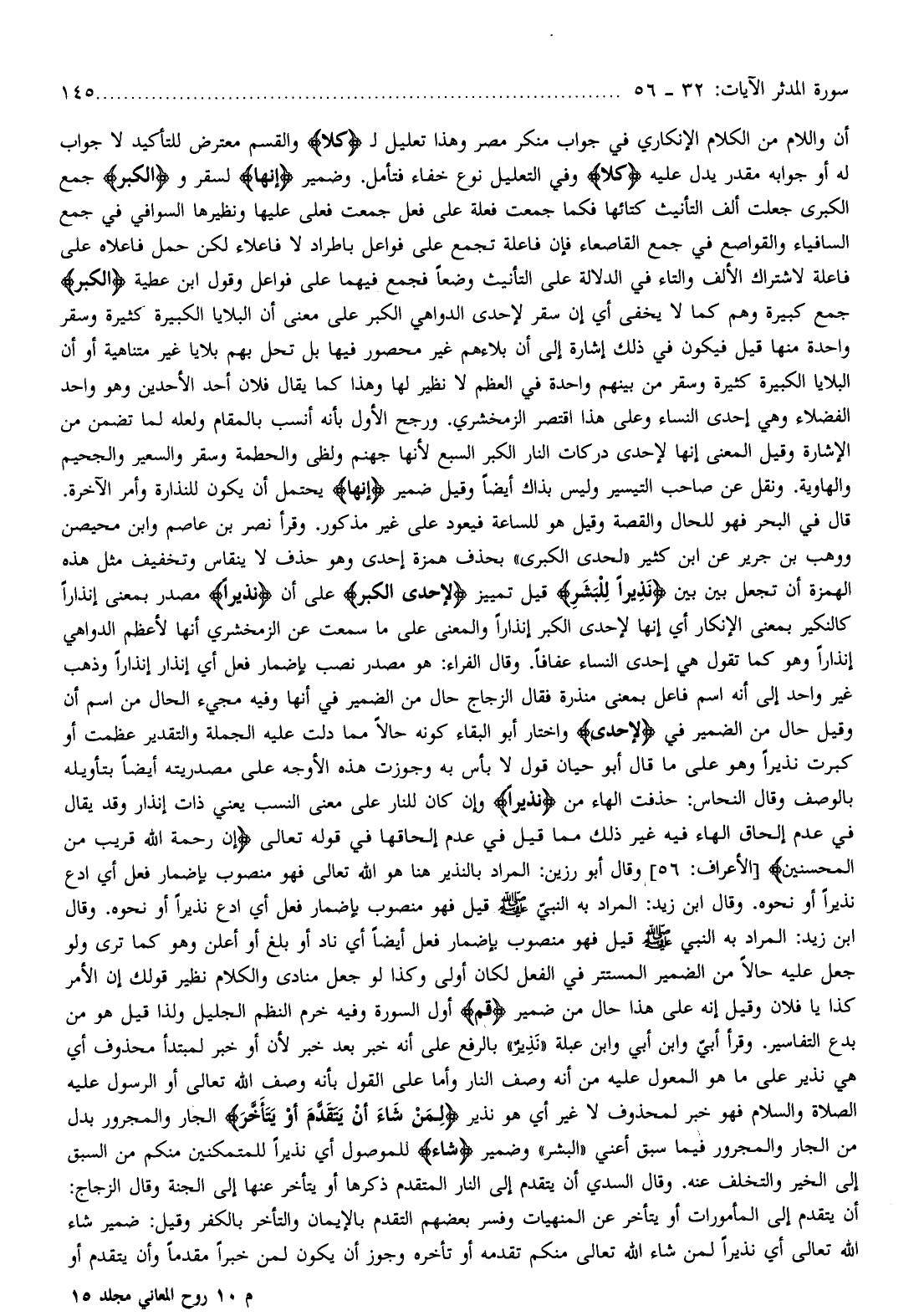 قال في البحر فهو للحال والقصة وقيل هو للساعة فيعود على غير مذكور. وقرأ نصر بن عاصم وابن محيصن ووهب بن جرير عن ابن كثير «لحدى الكبرى» بحذف همزة إحدى وهو حذف لا ينقاس وتخفيف مثل هذه الهمزة أن تجعل بين بين نَذِيراً لِلْبَشَرِ قيل تمييز لَإِحْدَى الْكُبَرِ على أن نَذِيراً مصدر بمعنى إنذارا كالنكير بمعنى الإنكار أي إنها لإحدى الكبر إنذارا والمعنى على ما سمعت عن الزمخشري أنها لأعظم الدواهي إنذارا وهو كما تقول هي إحدى النساء عفافا. وقال الفراء: هو مصدر نصب بإضمار فعل أي إنذار إنذارا وذهب غير واحد إلى أنه اسم فاعل بمعنى منذرة فقال الزجاج حال من الضمير في أنها وفيه مجيء الحال من اسم أن وقيل حال من الضمير في لَإِحْدَى واختار أبو البقاء كونه حالا مما دلت عليه الجملة والتقدير عظمت أو كبرت نذيرا وهو على ما قال أبو حيان قول لا بأس به وجوزت هذه الأوجه على مصدريته أيضا بتأويله بالوصف وقال النحاس: حذفت الهاء من نَذِيراً وإن كان للنار على معنى النسب يعني ذات إنذار وقد يقال في عدم إلحاق الهاء فيه غير ذلك مما قيل في عدم إلحاقها في قوله تعالى إِنَّ رَحْمَتَ اللَّهِ قَرِيبٌ مِنَ الْمُحْسِنِينَ [الأعراف: 56] وقال أبو رزين: المراد بالنذير هنا هو الله تعالى فهو منصوب بإضمار فعل أي ادع نذيرا أو نحوه. وقال ابن زيد: المراد به النبيّ صلّى الله عليه وسلم قيل فهو منصوب بإضمار فعل أي ادع نذيرا أو نحوه. وقال ابن زيد: المراد به النبي صلّى الله عليه وسلم قيل فهو منصوب بإضمار فعل أيضا أي ناد أو بلغ أو أعلن وهو كما ترى ولو جعل عليه حالا من الضمير المستتر في الفعل لكان أولى وكذا لو جعل منادى والكلام نظير قولك إن الأمر كذا يا فلان وقيل إنه على هذا حال من ضمير قُمْ أول السورة وفيه خرم النظم الجليل ولذا قيل هو من بدع التفاسير. وقرأ أبيّ وابن أبي وابن عبلة «نذير» بالرفع على أنه خبر بعد خبر لأن أو خبر لمبتدأ محذوف أي هي نذير على ما هو المعول عليه من أنه وصف النار وأما على القول بأنه وصف الله تعالى أو الرسول عليه الصلاة والسلام فهو خبر لمحذوف لا غير أي هو نذير لِمَنْ شاءَ مِنْكُمْ أَنْ يَتَقَدَّمَ أَوْ يَتَأَخَّرَ الجار والمجرور بدل من الجار والمجرور فيما سبق أعني «البشر» وضمير شاءَ للموصول أي نذيرا للمتمكنين منكم من السبق إلى الخير والتخلف عنه. وقال السدي أن يتقدم إلى النار المتقدم ذكرها أو يتأخر عنها إلى الجنة وقال الزجاج: