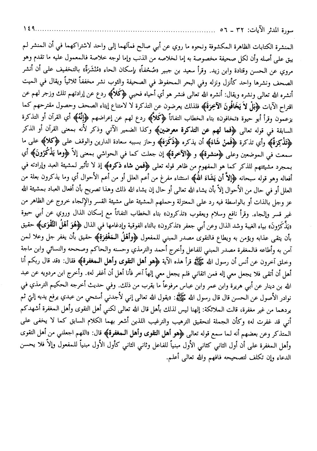 ونشره ويقال: أنشره الله تعالى فنشر هو أي أحياه فحيي كَلَّا ردع عن إرادتهم تلك وزجر لهم عن اقتراح الآيات بَلْ لا يَخافُونَ الْآخِرَةَ فلذلك يعرضون عن التذكرة لا لامتناع إيتاء الصحف وحصول مقترحهم كما يزعمون وقرأ أبو حيوة «تخافون» بتاء الخطاب التفاتا كَلَّا ردع لهم عن إعراضهم إِنَّهُ أي القرآن أو التذكرة السابقة في قوله تعالى فَما لَهُمْ عَنِ التَّذْكِرَةِ مُعْرِضِينَ وكذا الضمير الآتي وذكر لأنه بمعنى القرآن أو الذكر تَذْكِرَةٌ وأي تذكرة فَمَنْ شاءَ أن يذكره ذَكَرَهُ وحاز بسببه سعادة الدارين والوقف على كَلَّا على ما سمعت في الموضعين وعلى مُنَشَّرَةً والْآخِرَةَ إن جعلت كما في الحواشي بمعنى إلّا وَما يَذْكُرُونَ أي بمجرد مشيئتهم للذكر كما هو المفهوم من ظاهر قوله تعالى فَمَنْ شاءَ ذَكَرَهُ إذ لا تأثير لمشيئة العبد وإرادته في أفعاله وهو قوله سبحانه إِلَّا أَنْ يَشاءَ اللَّهُ استثناء مفرغ من أعم العلل أو من أعم الأحوال أي وما يذكرون بعلة من العلل أو في حال من الأحوال إلّا بأن يشاء الله تعالى أو حال إن يشاء الله ذلك وهذا تصريح بأن أفعال العباد بمشيئة الله عز وجل بالذات أو بالواسطة فيه رد على المعتزلة وحملهم المشيئة على مشيئة القسر والإلجاء خروج عن الظاهر من غير قسر وإلجاء. وقرأ نافع وسلام ويعقوب «تذكرون» بتاء الخطاب التفاتا مع إسكان الذال وروي عن أبي حيوة «يذّكرون» بياء الغيبة وشد الذال وعن أبي جعفر «تذكرون» بالتاء الفوقية وإدغامها في الذال هُوَ أَهْلُ التَّقْوى حقيق بأن يتقى عذابه ويؤمن به ويطاع فالتقوى مصدر المبني للمفعول وَأَهْلُ الْمَغْفِرَةِ حقيق بأن يغفر جل وعلا لمن آمن به وأطاعه فالمغفرة مصدر المبني للفاعل وأخرج أحمد والترمذي وحسنه والحاكم وصححه والنسائي وابن ماجة وخلق آخرون