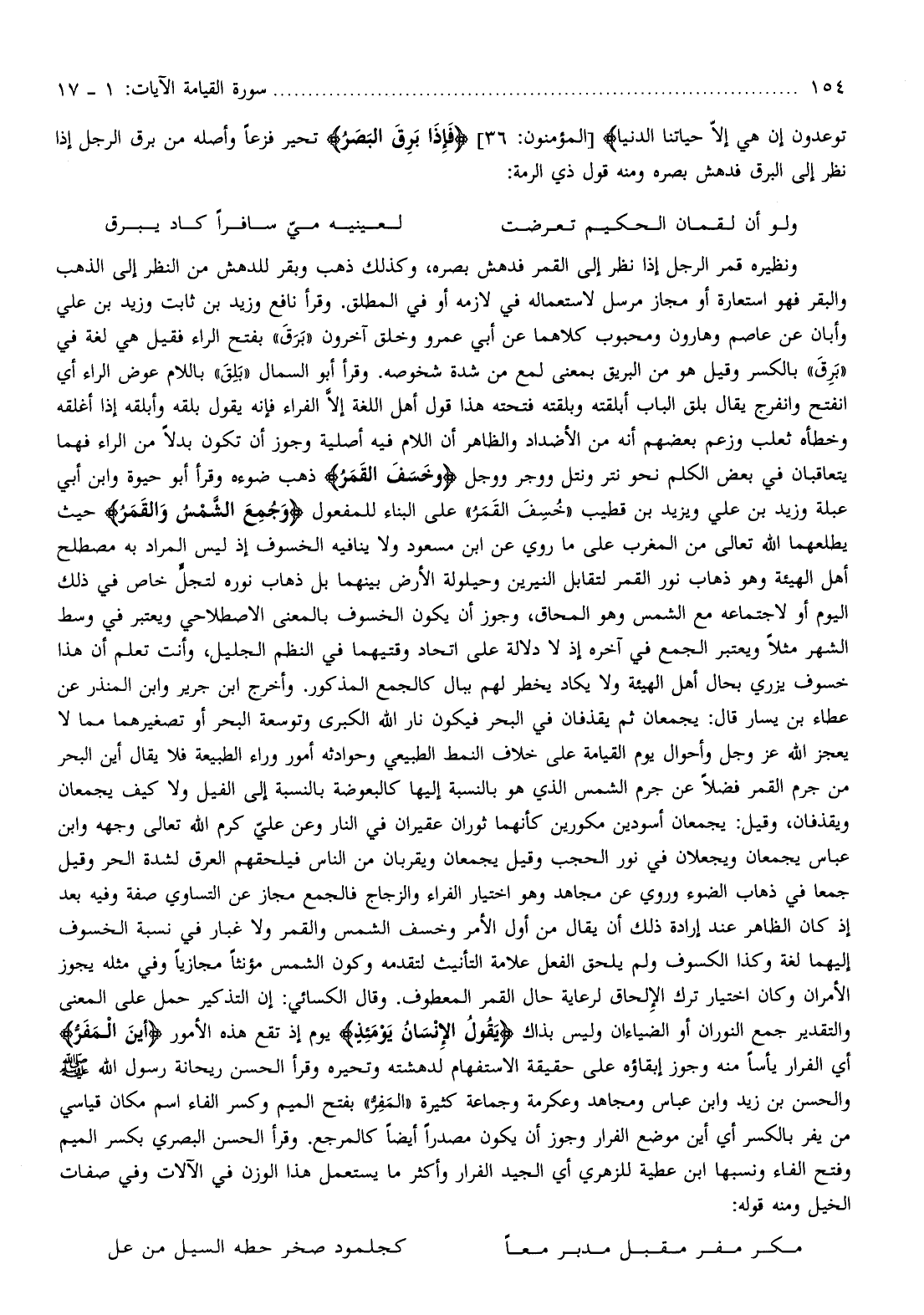 ونظيره قمر الرجل إذا نظر إلى القمر فدهش بصره، وكذلك ذهب وبقر للدهش من النظر إلى الذهب والبقر فهو استعارة أو مجاز مرسل لاستعماله في لازمه أو في المطلق. وقرأ نافع وزيد بن ثابت وزيد بن علي وأبان عن عاصم وهارون ومحبوب كلاهما عن أبي عمرو وخلق آخرون «برق» بفتح الراء فقيل هي لغة في «برق» بالكسر وقيل هو من البريق بمعنى لمع من شدة شخوصه. وقرأ أبو السمال «بلق» باللام عوض الراء أي انفتح وانفرج يقال بلق الباب أبلقته وبلقته فتحته هذا قول أهل اللغة إلّا الفراء فإنه يقول بلقه وأبلقه إذا أغلقه وخطأه ثعلب وزعم بعضهم أنه من الأضداد والظاهر أن اللام فيه أصلية وجوز أن تكون بدلا من الراء فهما يتعاقبان في بعض الكلم نحو نتر ونتل ووجر ووجل وَخَسَفَ الْقَمَرُ ذهب ضوءه وقرأ أبو حيوة وابن أبي عبلة وزيد بن علي ويزيد بن قطيب «خسف القمر» على البناء للمفعول وَجُمِعَ الشَّمْسُ وَالْقَمَرُ حيث يطلعهما الله تعالى من المغرب على ما روي عن ابن مسعود ولا ينافيه الخسوف إذ ليس المراد به مصطلح أهل الهيئة وهو ذهاب نور القمر لتقابل النيرين وحيلولة الأرض بينهما بل ذهاب نوره لتجلّ خاص في ذلك اليوم أو لاجتماعه مع الشمس وهو المحاق، وجوز أن يكون الخسوف بالمعنى الاصطلاحي ويعتبر في وسط الشهر مثلا ويعتبر الجمع في آخره إذ لا دلالة على اتحاد وقتيهما في النظم الجليل، وأنت تعلم أن هذا خسوف يزري بحال أهل الهيئة ولا يكاد يخطر لهم ببال كالجمع المذكور. وأخرج ابن جرير وابن المنذر عن عطاء بن يسار قال: يجمعان ثم يقذفان في البحر فيكون نار الله الكبرى وتوسعة البحر أو تصغيرهما مما لا يعجز الله عز وجل وأحوال يوم القيامة على خلاف النمط الطبيعي وحوادثه أمور وراء الطبيعة فلا يقال أين البحر من جرم القمر فضلا عن جرم الشمس الذي هو بالنسبة إليها كالبعوضة بالنسبة إلى الفيل ولا كيف يجمعان ويقذفان، وقيل: يجمعان أسودين مكورين كأنهما ثوران عقيران في النار وعن عليّ كرم الله تعالى وجهه وابن عباس يجمعان ويجعلان في نور الحجب وقيل يجمعان ويقربان من الناس فيلحقهم العرق لشدة الحر وقيل جمعا في ذهاب الضوء وروي عن مجاهد وهو اختيار الفراء والزجاج فالجمع مجاز عن التساوي صفة وفيه بعد إذ كان الظاهر عند إرادة ذلك أن يقال من أول الأمر وخسف الشمس والقمر ولا غبار في نسبة الخسوف إليهما لغة وكذا الكسوف ولم يلحق الفعل علامة التأنيث لتقدمه وكون الشمس مؤنثا مجازيا وفي مثله يجوز الأمران وكان اختيار ترك الإلحاق لرعاية حال القمر المعطوف. وقال الكسائي: إن التذكير حمل على المعنى والتقدير جمع النوران أو الضياءان وليس بذاك يَقُولُ الْإِنْسانُ يَوْمَئِذٍ يوم إذ تقع هذه الأمور أَيْنَ الْمَفَرُّ أي الفرار يأسا منه وجوز إبقاؤه على حقيقة الاستفهام لدهشته وتحيره وقرأ الحسن ريحانة رسول الله صلّى الله عليه وسلم والحسن بن زيد وابن عباس ومجاهد وعكرمة وجماعة كثيرة «المفرّ» بفتح الميم وكسر الفاء اسم مكان قياسي من يفر بالكسر أي أين موضع الفرار وجوز أن يكون مصدرا أيضا كالمرجع. وقرأ الحسن البصري بكسر الميم وفتح الفاء ونسبها ابن عطية للزهري أي الجيد الفرار وأكثر ما يستعمل هذا الوزن في الآلات وفي صفات الخيل ومنه قوله: