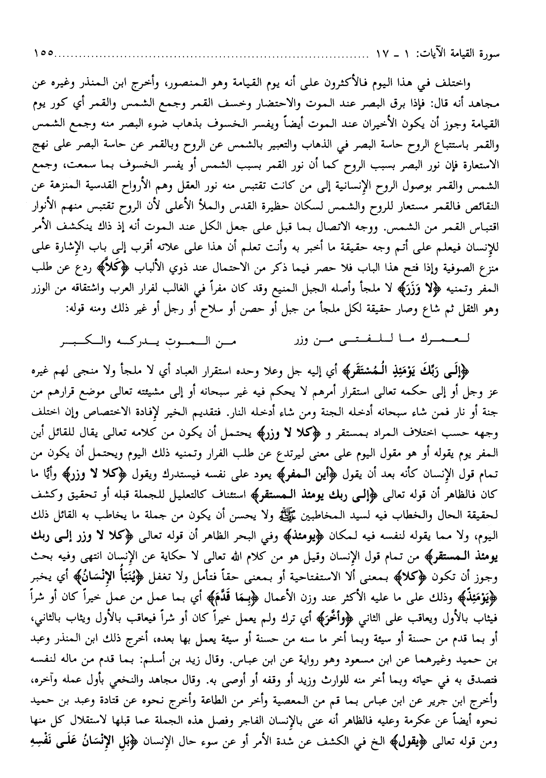 واختلف في هذا اليوم فالأكثرون على أنه يوم القيامة وهو المنصور، وأخرج ابن المنذر وغيره عن مجاهد أنه قال: فإذا برق البصر عند الموت والاحتضار وخسف القمر وجمع الشمس والقمر أي كور يوم القيامة وجوز أن يكون الأخيران عند الموت أيضا ويفسر الخسوف بذهاب ضوء البصر منه وجمع الشمس والقمر باستتباع الروح حاسة البصر في الذهاب والتعبير بالشمس عن الروح وبالقمر عن حاسة البصر على نهج الاستعارة فإن نور البصر بسبب الروح كما أن نور القمر بسبب الشمس أو يفسر الخسوف بما سمعت، وجمع الشمس والقمر بوصول الروح الإنسانية إلى من كانت تقتبس منه نور العقل وهم الأرواح القدسية المنزهة عن النقائص فالقمر مستعار للروح والشمس لسكان حظيرة القدس والملأ الأعلى لأن الروح تقتبس منهم الأنوار اقتباس القمر من الشمس. ووجه الاتصال بما قبل على جعل الكل عند الموت أنه إذ ذاك ينكشف الأمر للإنسان فيعلم على أتم وجه حقيقة ما أخبر به وأنت تعلم أن هذا على علاته أقرب إلى باب الإشارة على منزع الصوفية وإذا فتح هذا الباب فلا حصر فيما ذكر من الاحتمال عند ذوي الألباب كَلَّا ردع عن طلب المفر وتمنيه لا وَزَرَ لا ملجأ وأصله الجبل المنيع وقد كان مفرا في الغالب لفرار العرب واشتقاقه من الوزر وهو الثقل ثم شاع وصار حقيقة لكل ملجأ من جبل أو حصن أو سلاح أو رجل أو غير ذلك ومنه قوله: