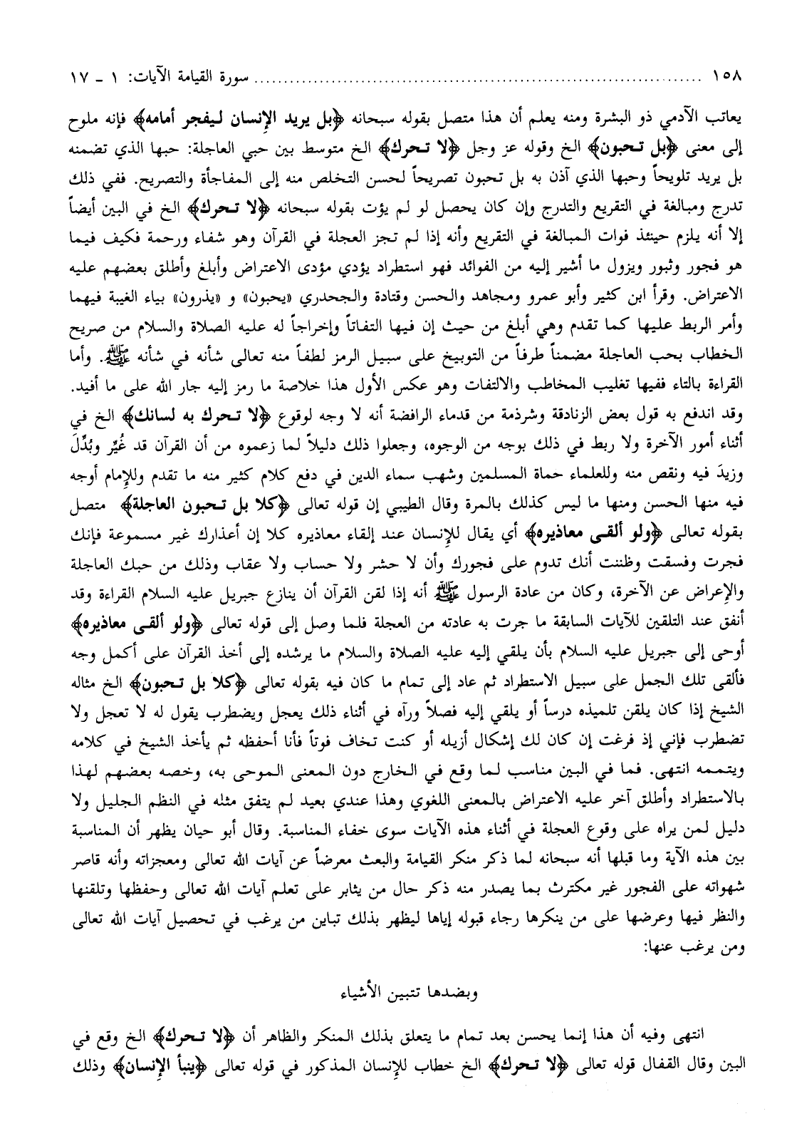 إلخ في أثناء أمور الآخرة ولا ربط في ذلك بوجه من الوجوه، وجعلوا ذلك دليلا لما زعموه من أن القرآن قد غيّر وبدّل وزيد فيه ونقص منه وللعلماء حماة المسلمين وشهب سماء الدين في دفع كلام كثير منه ما تقدم وللإمام أوجه فيه منها الحسن ومنها ما ليس كذلك بالمرة وقال الطيبي إن قوله تعالى كَلَّا بَلْ تُحِبُّونَ الْعاجِلَةَ متصل بقوله تعالى وَلَوْ أَلْقى مَعاذِيرَهُ