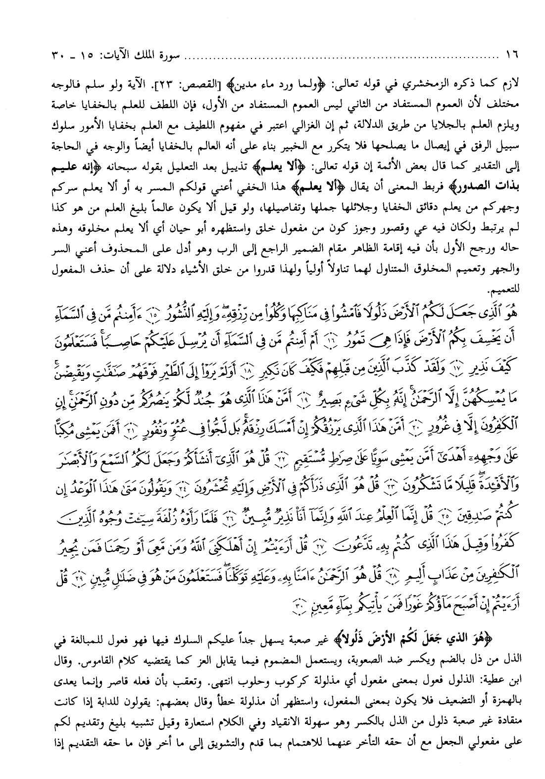 هُوَ الَّذِي جَعَلَ لَكُمُ الْأَرْضَ ذَلُولًا غير صعبة يسهل جدا عليكم السلوك فيها فهو فعول للمبالغة في الذل من ذل بالضم ويكسر ضد الصعوبة، ويستعمل المضموم فيما يقابل العز كما يقتضيه كلام القاموس. وقال ابن عطية: الذلول فعول بمعنى مفعول أي مذلولة كركوب وحلوب انتهى. وتعقب بأن فعله قاصر وإنما يعدى بالهمزة أو التضعيف فلا يكون بمعنى المفعول، واستظهر أن مذلولة خطأ وقال بعضهم: يقولون للدابة إذا كانت منقادة غير صعبة ذلول من الذل بالكسر وهو سهولة الانقياد وفي الكلام استعارة وقيل تشبيه بليغ وتقديم لكم على مفعولي الجعل مع أن حقه التأخر عنهما للاهتمام بما قدم والتشويق إلى ما أخر فإن ما حقه التقديم إذا