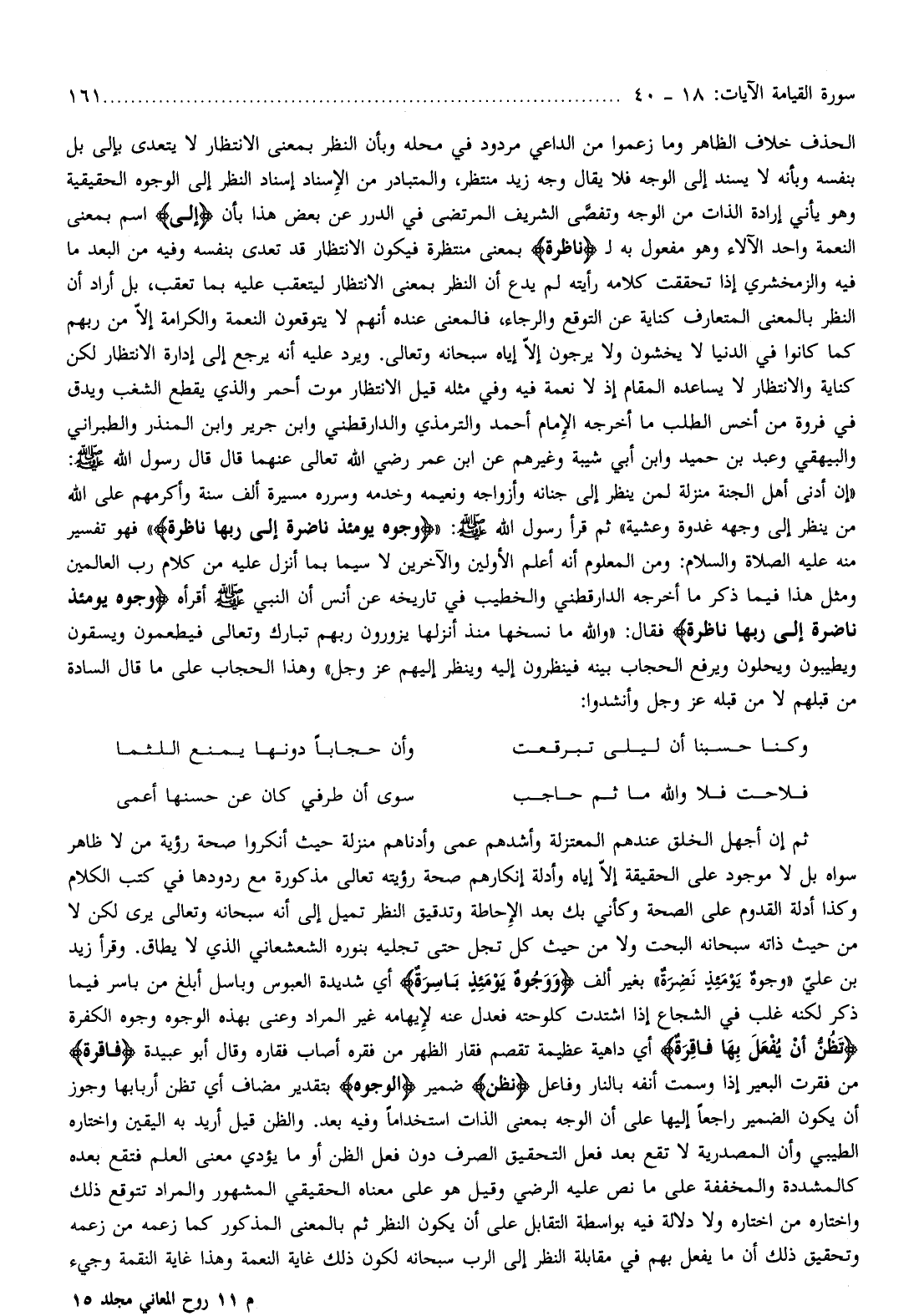 الحذف خلاف الظاهر وما زعموا من الداعي مردود في محله وبأن النظر بمعنى الانتظار لا يتعدى بإلى بل بنفسه وبأنه لا يسند إلى الوجه فلا يقال وجه زيد منتظر، والمتبادر من الإسناد إسناد النظر إلى الوجوه الحقيقية وهو يأني إرادة الذات من الوجه وتفصّى الشريف المرتضى في الدرر عن بعض هذا بأن إِلى اسم بمعنى النعمة واحد الآلاء وهو مفعول به ل ناظِرَةٌ بمعنى منتظرة فيكون الانتظار قد تعدى بنفسه وفيه من البعد ما فيه والزمخشري إذا تحققت كلامه رأيته لم يدع أن النظر بمعنى الانتظار ليتعقب عليه بما تعقب، بل أراد أن النظر بالمعنى المتعارف كناية عن التوقع والرجاء، فالمعنى عنده أنهم لا يتوقعون النعمة والكرامة إلّا من ربهم كما كانوا في الدنيا لا يخشون ولا يرجون إلّا إياه سبحانه وتعالى. ويرد عليه أنه يرجع إلى إدارة الانتظار لكن كناية والانتظار لا يساعده المقام إذ لا نعمة فيه وفي مثله قيل الانتظار موت أحمر والذي يقطع الشغب ويدق في فروة من أخس الطلب ما