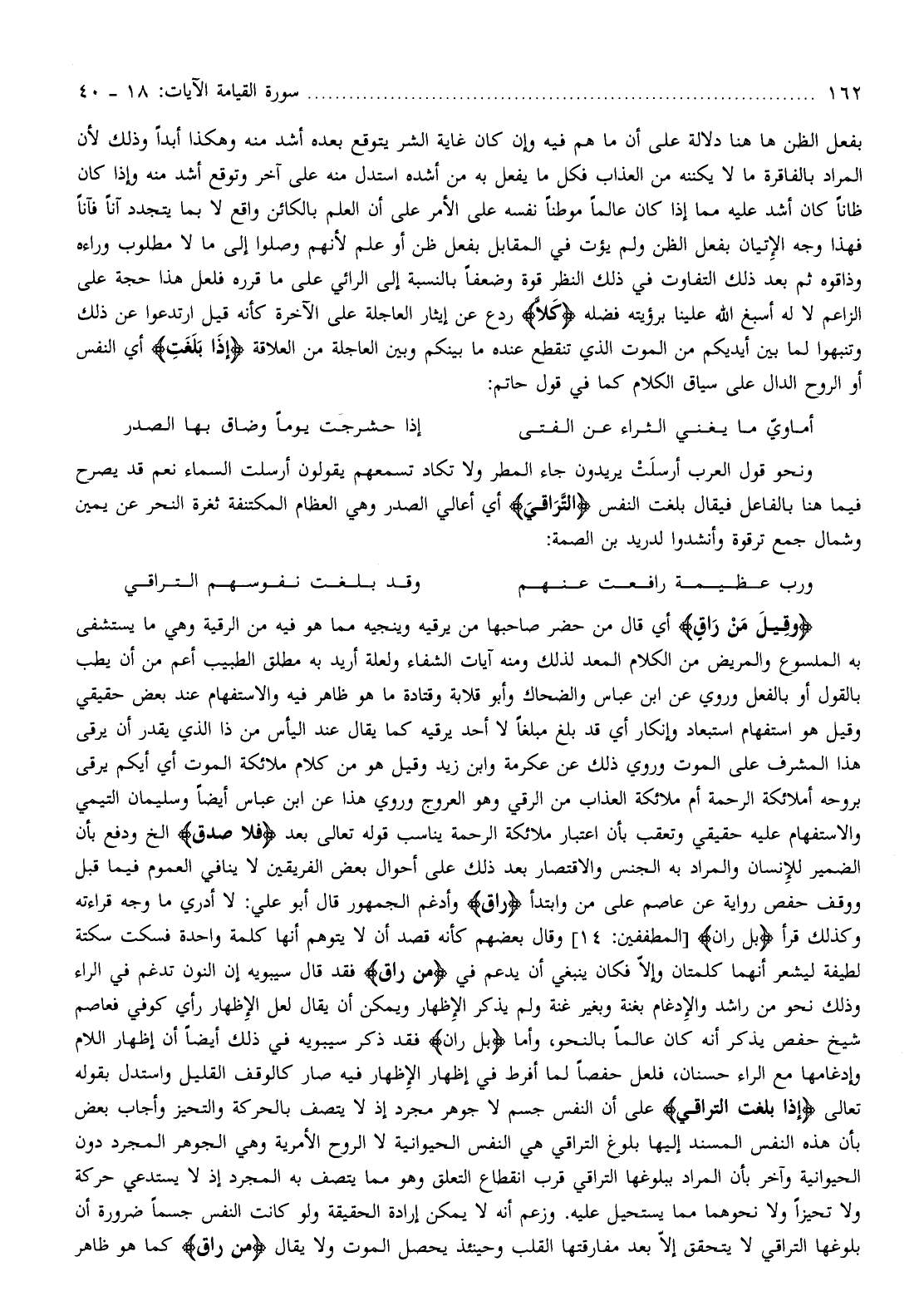 فقد قال سيبويه إن النون تدغم في الراء وذلك نحو من راشد والإدغام بغنة وبغير غنة ولم يذكر الإظهار ويمكن أن يقال لعل الإظهار رأي كوفي فعاصم شيخ حفص يذكر أنه كان عالما بالنحو، وأما بَلْ رانَ فقد ذكر سيبويه في ذلك أيضا أن إظهار اللام وإدغامها مع الراء حسنان، فلعل حفصا لما أفرط في إظهار الإظهار فيه صار كالوقف القليل واستدل بقوله تعالى إِذا بَلَغَتِ التَّراقِيَ على أن النفس جسم لا جوهر مجرد إذ لا يتصف بالحركة والتحيز وأجاب بعض بأن هذه النفس المسند إليها بلوغ التراقي هي النفس الحيوانية لا الروح الأمرية وهي الجوهر المجرد دون الحيوانية وآخر بأن المراد ببلوغها التراقي قرب انقطاع التعلق وهو مما يتصف به المجرد إذ لا يستدعي حركة ولا تحيزا ولا نحوهما مما يستحيل عليه. وزعم أنه لا يمكن إرادة الحقيقة ولو كانت النفس جسما ضرورة أن بلوغها التراقي لا يتحقق إلّا بعد مفارقتها القلب وحينئذ يحصل الموت ولا يقال مَنْ راقٍ