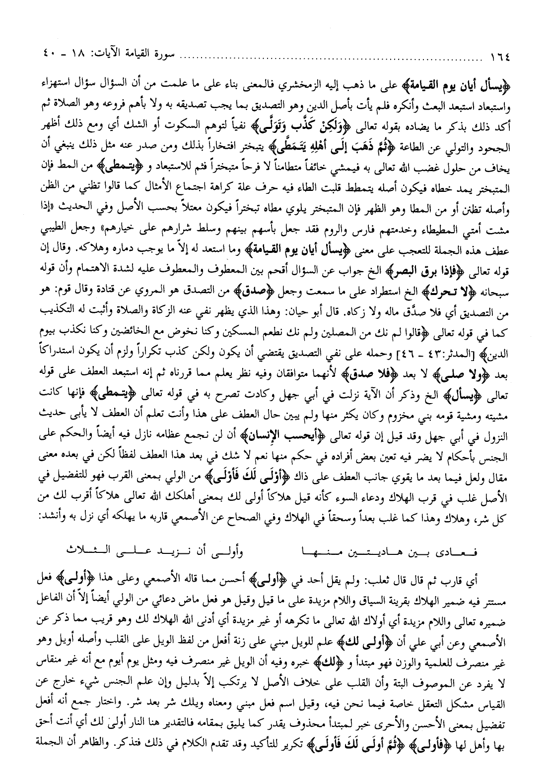 يَسْئَلُ أَيَّانَ يَوْمُ الْقِيامَةِ على ما ذهب إليه الزمخشري فالمعنى بناء على ما علمت من أن السؤال سؤال استهزاء واستبعاد استبعد البعث وأنكره فلم يأت بأصل الدين وهو التصديق بما يجب تصديقه به ولا بأهم فروعه وهو الصلاة ثم أكد ذلك بذكر ما يضاده بقوله تعالى وَلكِنْ كَذَّبَ وَتَوَلَّى نفيا لتوهم السكوت أو الشك أي ومع ذلك أظهر الجحود والتولي عن الطاعة ثُمَّ ذَهَبَ إِلى أَهْلِهِ يَتَمَطَّى يتبختر افتخارا بذلك ومن صدر عنه مثل ذلك ينبغي أن يخاف من حلول غضب الله تعالى به فيمشي خائفا متطامنا لا فرحا متبخترا فثم للاستبعاد ويَتَمَطَّى من المط فإن المتبختر يمد خطاه فيكون أصله يتمطط قلبت الطاء فيه حرف علة كراهة اجتماع الأمثال كما قالوا تظني من الظن وأصله تظنن أو من المطا وهو الظهر فإن المتبختر يلوي مطاه تبخترا فيكون معتلا بحسب الأصل