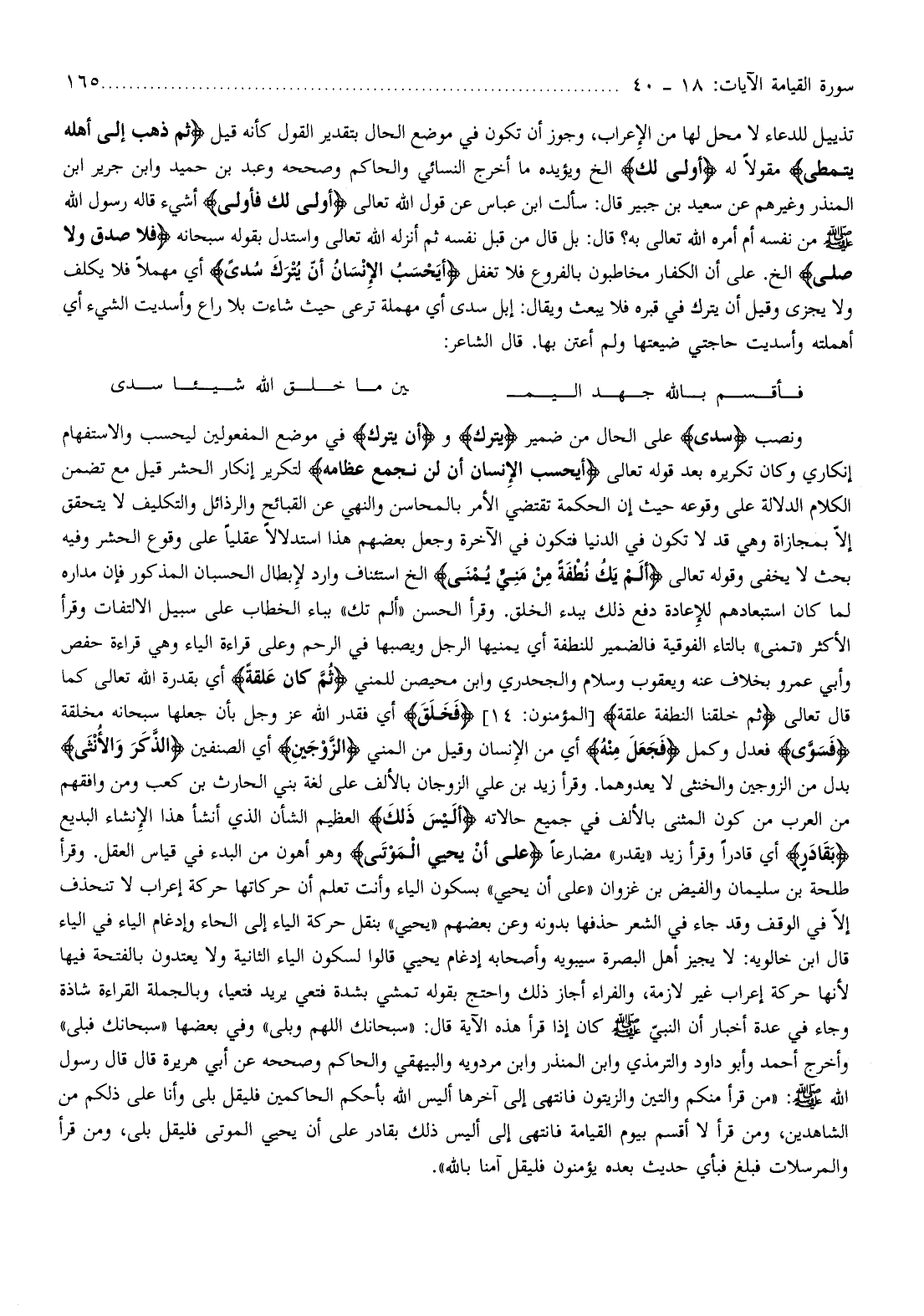 تذييل للدعاء لا محل لها من الإعراب، وجوز أن تكون في موضع الحال بتقدير القول كأنه قيل ثُمَّ ذَهَبَ إِلى أَهْلِهِ يَتَمَطَّى مقولا له أَوْلى لَكَ إلخ ويؤيده ما أخرج النسائي والحاكم وصححه وعبد بن حميد وابن جرير ابن المنذر وغيرهم عن سعيد بن جبير قال: سألت ابن عباس عن قول الله تعالى أَوْلى لَكَ فَأَوْلى أشيء قاله رسول الله صلّى الله عليه وسلم من نفسه أم أمره الله تعالى به؟ قال: بل قال من قبل نفسه ثم أنزله الله تعالى واستدل بقوله سبحانه فَلا صَدَّقَ وَلا صَلَّى إلخ. على أن الكفار مخاطبون بالفروع فلا تغفل أَيَحْسَبُ الْإِنْسانُ أَنْ يُتْرَكَ سُدىً أي مهملا فلا يكلف ولا يجزى وقيل أن يترك في قبره فلا يبعث ويقال: إبل سدى أي مهملة ترعى حيث شاءت بلا راع وأسديت الشيء أي أهملته وأسديت حاجتي ضيعتها ولم أعتن بها. قال الشاعر: