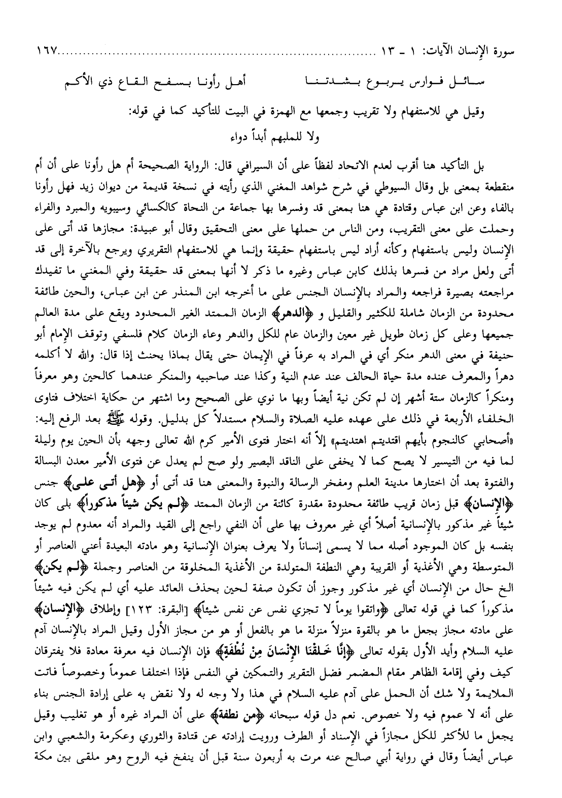 ولا للملبهم أبدا دواء بل التأكيد هنا أقرب لعدم الاتحاد لفظا على أن السيرافي قال: الرواية الصحيحة أم هل رأونا على أن أم منقطعة بمعنى بل وقال السيوطي في شرح شواهد المغني الذي رأيته في نسخة قديمة من ديوان زيد فهل رأونا بالفاء وعن ابن عباس وقتادة هي هنا بمعنى قد وفسرها بها جماعة من النحاة كالكسائي وسيبويه والمبرد والفراء وحملت على معنى التقريب، ومن الناس من حملها على معنى التحقيق وقال أبو عبيدة: مجازها قد أتى على الإنسان وليس باستفهام وكأنه أراد ليس باستفهام حقيقة وإنما هي للاستفهام التقريري ويرجع بالآخرة إلى قد أتى ولعل مراد من فسرها بذلك كابن عباس وغيره ما ذكر لا أنها بمعنى قد حقيقة وفي المغني ما تفيدك مراجعته بصيرة فراجعه والمراد بالإنسان الجنس على ما أخرجه ابن المنذر عن ابن عباس، والحين طائفة محدودة من الزمان شاملة للكثير والقليل والدَّهْرِ الزمان الممتد الغير المحدود ويقع على مدة العالم جميعها وعلى كل زمان طويل غير معين والزمان عام للكل والدهر وعاء الزمان كلام فلسفي وتوقف الإمام أبو حنيفة في معنى الدهر منكر أي في المراد به عرفا في الإيمان حتى يقال بماذا يحنث إذا قال: والله لا أكلمه دهرا والمعرف عنده مدة حياة الحالف عند عدم النية وكذا عند صاحبيه والمنكر عندهما كالحين وهو معرفا ومنكرا كالزمان ستة أشهر إن لم تكن نية أيضا وبها ما نوي على الصحيح وما اشتهر من حكاية اختلاف فتاوى الخلفاء الأربعة في ذلك على عهده عليه الصلاة والسلام مستدلا كل بدليل.