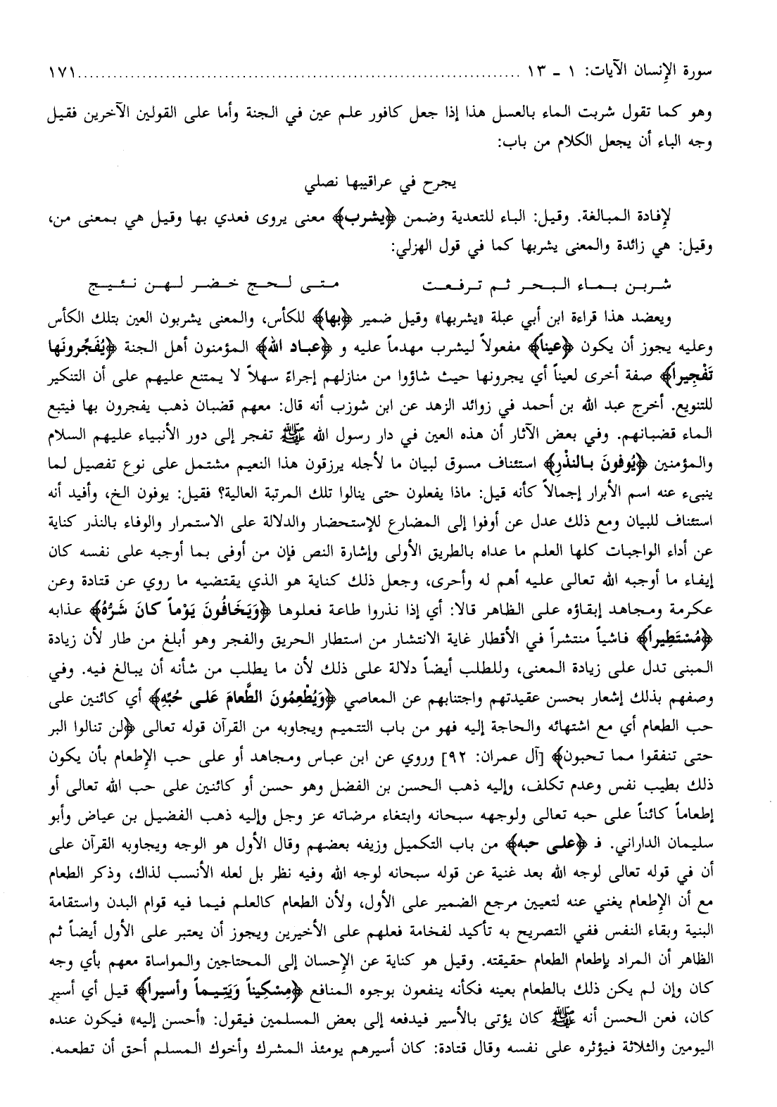 ويعضد هذا قراءة ابن أبي عبلة «يشربها» وقيل ضمير بِها للكأس، والمعنى يشربون العين بتلك الكأس وعليه يجوز أن يكون عَيْناً مفعولا ليشرب مهدما عليه وعِبادُ اللَّهِ المؤمنون أهل الجنة يُفَجِّرُونَها تَفْجِيراً صفة أخرى لعينا أي يجرونها حيث شاؤوا من منازلهم إجراء سهلا لا يمتنع عليهم على أن التنكير للتنويع. أخرج عبد الله بن أحمد في زوائد الزهد عن ابن شوزب أنه قال: معهم قضبان ذهب يفجرون بها فيتبع الماء قضبانهم. وفي بعض الآثار أن هذه العين في دار رسول الله صلّى الله عليه وسلم تفجر إلى دور الأنبياء عليهم السلام والمؤمنين يُوفُونَ بِالنَّذْرِ استئناف مسوق لبيان ما لأجله يرزقون هذا النعيم مشتمل على نوع تفصيل لما ينبىء عنه اسم الأبرار إجمالا كأنه قيل: ماذا يفعلون حتى ينالوا تلك المرتبة العالية؟ فقيل: يوفون إلخ، وأفيد أنه استئناف للبيان ومع ذلك عدل عن أوفوا إلى المضارع للإستحضار والدلالة على الاستمرار والوفاء بالنذر كناية عن أداء الواجبات كلها العلم ما عداه بالطريق الأولى وإشارة النص فإن من أوفى بما أوجبه على نفسه كان إيفاء ما أوجبه الله تعالى عليه أهم له وأحرى، وجعل ذلك كناية هو الذي يقتضيه ما روي عن قتادة وعن عكرمة ومجاهد إبقاؤه على الظاهر قالا: أي إذا نذروا طاعة فعلوها وَيَخافُونَ يَوْماً كانَ شَرُّهُ عذابه مُسْتَطِيراً فاشيا منتشرا في الأقطار غاية الانتشار من استطار الحريق والفجر وهو أبلغ من طار لأن زيادة المبنى تدل على زيادة المعنى، وللطلب أيضا دلالة على ذلك لأن ما يطلب من شأنه أن يبالغ فيه. وفي وصفهم بذلك إشعار بحسن عقيدتهم واجتنابهم عن المعاصي وَيُطْعِمُونَ الطَّعامَ عَلى حُبِّهِ أي كائنين على حب الطعام أي مع اشتهائه والحاجة إليه فهو من باب التتميم ويجاوبه من القرآن قوله تعالى لَنْ تَنالُوا الْبِرَّ حَتَّى تُنْفِقُوا مِمَّا تُحِبُّونَ [آل عمران: 92] وروي عن ابن عباس ومجاهد أو على حب الإطعام بأن يكون ذلك بطيب نفس وعدم تكلف، وإليه ذهب الحسن بن الفضل وهو حسن أو كائنين على حب الله تعالى أو إطعاما كائنا على حبه تعالى ولوجهه سبحانه وابتغاء مرضاته عز وجل وإليه ذهب الفضيل بن عياض وأبو سليمان الداراني. ف عَلى حُبِّهِ من باب التكميل وزيفه بعضهم وقال الأول هو الوجه ويجاوبه القرآن على أن في قوله تعالى لوجه الله بعد غنية عن قوله سبحانه لوجه الله وفيه نظر بل لعله الأنسب لذاك، وذكر الطعام مع أن الإطعام يغني عنه لتعيين مرجع الضمير على الأول، ولأن الطعام كالعلم فيما فيه قوام البدن واستقامة البنية وبقاء النفس ففي التصريح به تأكيد لفخامة فعلهم على الأخيرين ويجوز أن يعتبر على الأول أيضا ثم الظاهر أن المراد بإطعام الطعام حقيقته. وقيل هو كناية عن الإحسان إلى المحتاجين والمواساة معهم بأي وجه كان وإن لم يكن ذلك بالطعام بعينه فكأنه ينفعون بوجوه المنافع مِسْكِيناً وَيَتِيماً وَأَسِيراً قيل أي أسير كان،