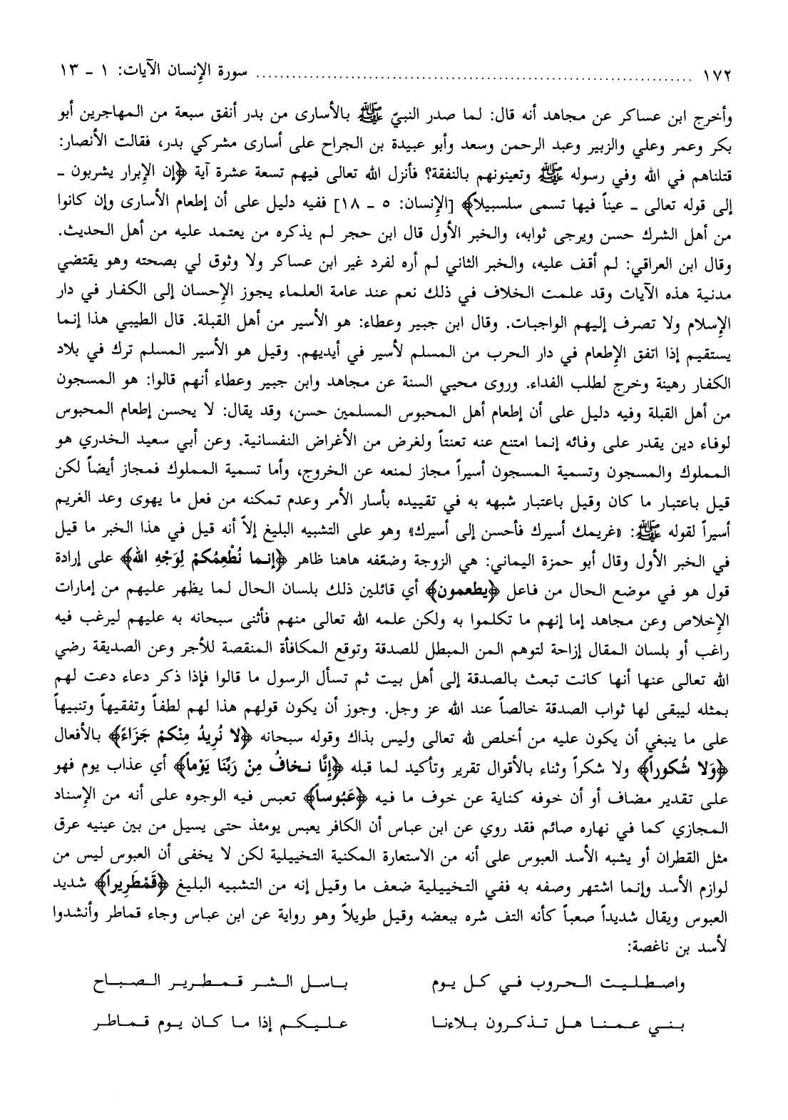 وقال ابن العراقي: لم أقف عليه، والخبر الثاني لم أره لفرد غير ابن عساكر ولا وثوق لي بصحته وهو يقتضي مدنية هذه الآيات وقد علمت الخلاف في ذلك نعم عند عامة العلماء يجوز الإحسان إلى الكفار في دار الإسلام ولا تصرف إليهم الواجبات. وقال ابن جبير وعطاء: هو الأسير من أهل القبلة. قال الطيبي هذا إنما يستقيم إذا اتفق الإطعام في دار الحرب من المسلم لأسير في أيديهم. وقيل هو الأسير المسلم ترك في بلاد الكفار رهينة وخرج لطلب الفداء. وروى محيي السنة عن مجاهد وابن جبير وعطاء أنهم قالوا: هو المسجون من أهل القبلة وفيه دليل على أن إطعام أهل المحبوس المسلمين حسن، وقد يقال: لا يحسن إطعام المحبوس لوفاء دين يقدر على وفائه إنما امتنع عنه تعنتا ولغرض من الأغراض النفسانية. وعن أبي سعيد الخدري هو المملوك والمسجون وتسمية المسجون أسيرا مجاز لمنعه عن الخروج، وأما تسمية المملوك فمجاز أيضا لكن قيل باعتبار ما كان وقيل باعتبار شبهه به في تقييده بأسار الأمر وعدم تمكنه من فعل ما يهوى وعد الغريم أسيرا