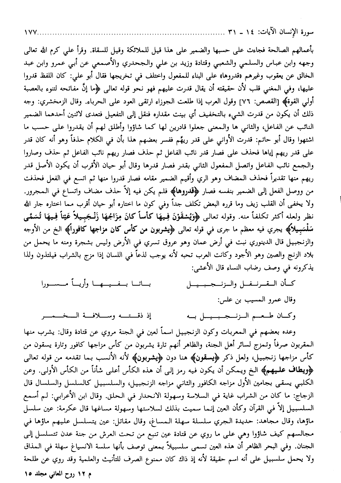 ولا يخفى أن القلب زيف وما قرره البعض تكلف جدا وفي كون ما اختاره أبو حيان أقرب مما اختاره جار الله نظر ولعله أكثر تكلفا منه. وقوله تعالى وَيُسْقَوْنَ فِيها كَأْساً كانَ مِزاجُها زَنْجَبِيلًا عَيْناً فِيها تُسَمَّى سَلْسَبِيلًا يجري فيه معظم ما جرى في قوله تعالى يَشْرَبُونَ مِنْ كَأْسٍ كانَ مِزاجُها كافُوراً إلخ من الأوجه والزنجبيل قال الدينوري نبت في أرض عمان وهو عروق تسري في الأرض وليس بشجرة ومنه ما يحمل من بلاد الزنج والصين وهو الأجود وكانت العرب تحبه لأنه يوجب لذعا في اللسان إذا مزج بالشراب فيلتذون ولذا يذكرونه في وصف رضاب النساء قال الأعشى: