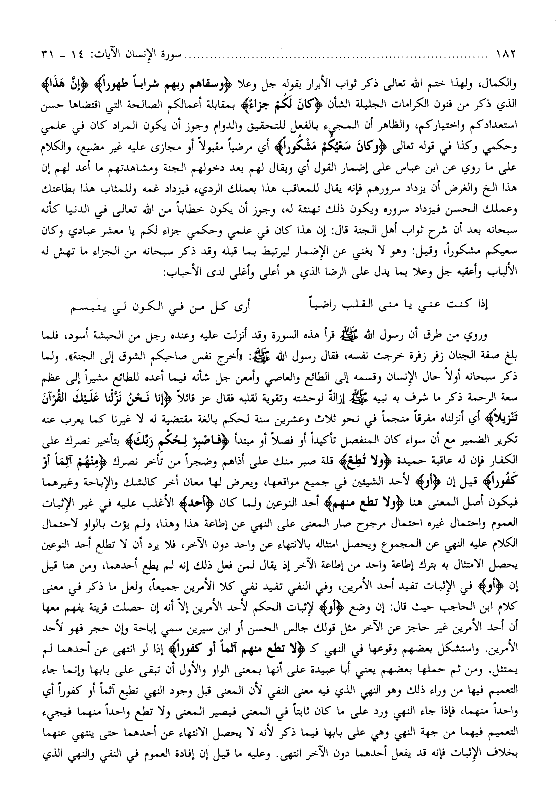 ولما ذكر سبحانه أولا حال الإنسان وقسمه إلى الطائع والعاصي وأمعن جل شأنه فيما أعده للطائع مشيرا إلى عظم سعة الرحمة ذكر ما شرف به نبيه صلّى الله عليه وسلم إزالة لوحشته وتقوية لقلبه فقال عز قائلا إِنَّا نَحْنُ نَزَّلْنا عَلَيْكَ الْقُرْآنَ تَنْزِيلًا أي أنزلناه مفرقا منجما في نحو ثلاث وعشرين سنة لحكم بالغة مقتضية له لا غيرنا كما يعرب عنه تكرير الضمير مع أن سواء كان المنفصل تأكيدا أو فصلا أو مبتدأ فَاصْبِرْ لِحُكْمِ رَبِّكَ بتأخير نصرك على الكفار فإن له عاقبة حميدة وَلا تُطِعْ قلة صبر منك على أذاهم وضجرا من تأخر نصرك مِنْهُمْ آثِماً أَوْ كَفُوراً قيل إن أَوْ لأحد الشيئين في جميع مواقعها، ويعرض لها معان أخر كالشك والإباحة وغيرهما فيكون أصل المعنى هنا وَلا تُطِعْ مِنْهُمْ أحد النوعين ولما كان أحد الأغلب عليه في غير الإثبات العموم واحتمال غيره احتمال مرجوح صار المعنى على النهي عن إطاعة هذا وهذا، ولم يؤت بالواو لاحتمال الكلام عليه النهي عن المجموع ويحصل امتثاله بالانتهاء عن واحد دون الآخر، فلا يرد أن لا تطلع أحد النوعين يحصل الامتثال به بترك إطاعة واحد من إطاعة الآخر إذ يقال لمن فعل ذلك إنه لم يطع أحدهما، ومن هنا قيل إن أَوْ في الإثبات تفيد أحد الأمرين، وفي النفي تفيد نفي كلا الأمرين جميعا، ولعل ما ذكر في معنى كلام ابن الحاجب حيث قال: إن وضع أَوْ لإثبات الحكم لأحد الأمرين إلّا أنه إن حصلت قرينة يفهم معها أن أحد الأمرين غير حاجز عن الآخر مثل قولك جالس الحسن أو ابن سيرين سمي إباحة وإن حجر فهو لأحد الأمرين. واستشكل بعضهم وقوعها في النهي ك لا تُطِعْ مِنْهُمْ آثِماً أَوْ كَفُوراً إذا لو انتهى عن أحدهما لم يمتثل. ومن ثم حملها بعضهم يعني أبا عبيدة على أنها بمعنى الواو والأول أن تبقى على بابها وإنما جاء التعميم فيها من وراء ذلك وهو النهي الذي فيه معنى النفي لأن المعنى قبل وجود النهي تطيع آثما أو كفورا أي واحدا منهما، فإذا جاء النهي ورد على ما كان ثابتا في المعنى فيصير المعنى ولا تطع واحدا منهما فيجيء التعميم فيهما من جهة النهي وهي على بابها فيما ذكر لأنه لا يحصل الانتهاء عن أحدهما حتى ينتهي عنهما بخلاف الإثبات فإنه قد يفعل أحدهما دون الآخر انتهى. وعليه ما قيل إن إفادة العموم في النفي والنهي الذي