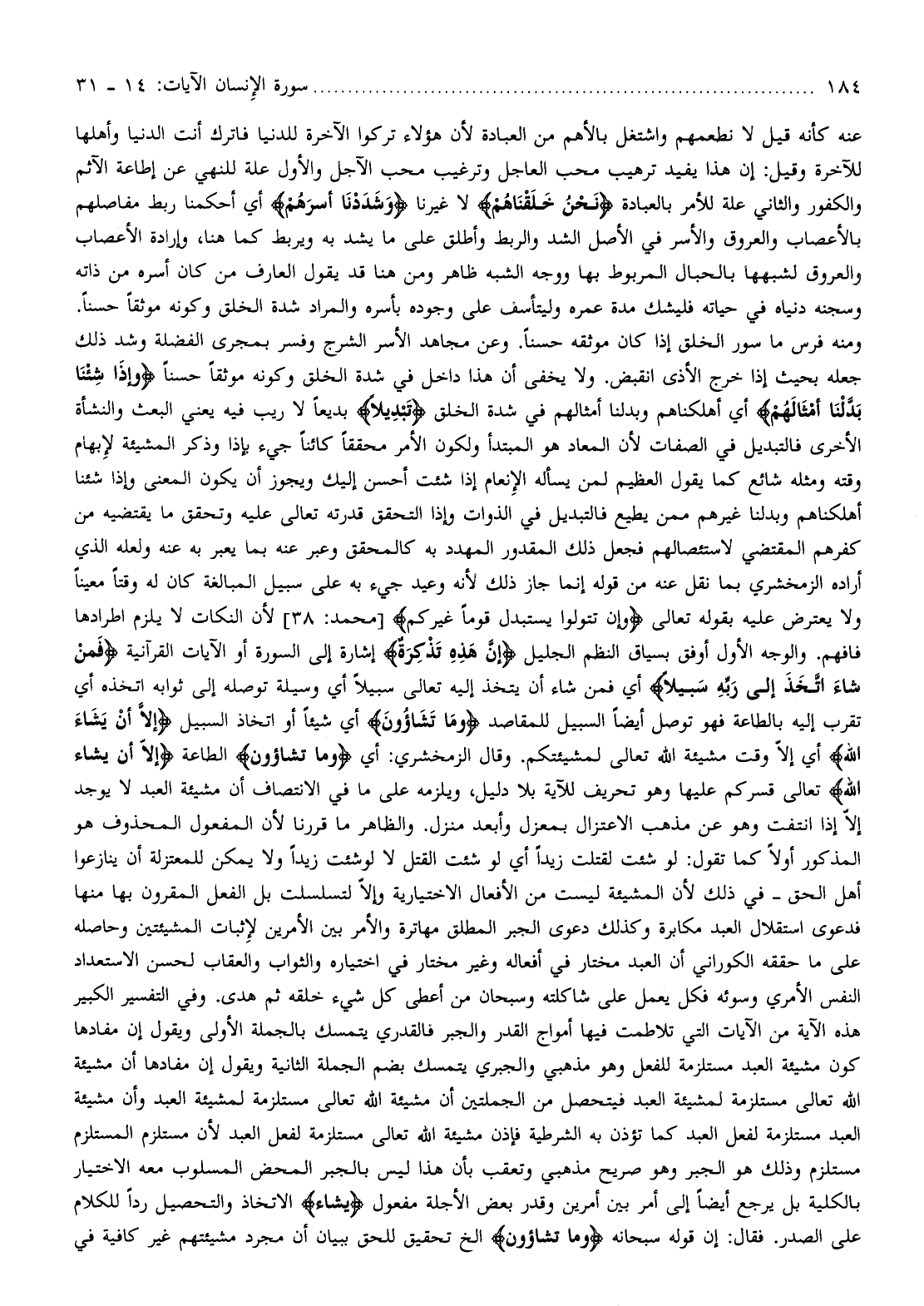 ومنه فرس ما سور الخلق إذا كان موثقه حسنا. وعن مجاهد الأسر الشرج وفسر بمجرى الفضلة وشد ذلك جعله بحيث إذا خرج الأذى انقبض. ولا يخفى أن هذا داخل في شدة الخلق وكونه موثقا حسنا وَإِذا شِئْنا بَدَّلْنا أَمْثالَهُمْ أي أهلكناهم وبدلنا أمثالهم في شدة الخلق تَبْدِيلًا بديعا لا ريب فيه يعني البعث والنشأة الأخرى فالتبديل في الصفات لأن المعاد هو المبتدأ ولكون الأمر محققا كائنا جيء بإذا وذكر المشيئة لإبهام وقته ومثله شائع كما يقول العظيم لمن يسأله الإنعام إذا شئت أحسن إليك ويجوز أن يكون المعنى وإذا شئنا أهلكناهم وبدلنا غيرهم ممن يطيع فالتبديل في الذوات وإذا التحقق قدرته تعالى عليه وتحقق ما يقتضيه من كفرهم المقتضي لاستئصالهم فجعل ذلك المقدور المهدد به كالمحقق وعبر عنه بما يعبر به عنه ولعله الذي أراده الزمخشري بما نقل عنه من قوله إنما جاز ذلك لأنه وعيد جيء به على سبيل المبالغة كان له وقتا معينا ولا يعترض عليه بقوله تعالى وَإِنْ تَتَوَلَّوْا يَسْتَبْدِلْ قَوْماً غَيْرَكُمْ [محمد: 38] لأن النكات لا يلزم اطرادها فافهم. والوجه الأول أوفق بسياق النظم الجليل إِنَّ هذِهِ تَذْكِرَةٌ إشارة إلى السورة أو الآيات القرآنية فَمَنْ شاءَ اتَّخَذَ إِلى رَبِّهِ سَبِيلًا أي فمن شاء أن يتخذ إليه تعالى سبيلا أي وسيلة توصله إلى ثوابه اتخذه أي تقرب إليه بالطاعة فهو توصل أيضا السبيل للمقاصد وَما تَشاؤُنَ أي شيئا أو اتخاذ السبيل إِلَّا أَنْ يَشاءَ اللَّهُ أي إلّا وقت مشيئة الله تعالى لمشيئتكم. وقال الزمخشري: أي وَما تَشاؤُنَ الطاعة إِلَّا أَنْ يَشاءَ اللَّهُ تعالى قسركم عليها وهو تحريف للآية بلا دليل، ويلزمه على ما في الانتصاف أن مشيئة العبد لا يوجد إلّا إذا انتفت وهو عن مذهب الاعتزال بمعزل وأبعد منزل. والظاهر ما قررنا لأن المفعول المحذوف هو المذكور أولا كما تقول: لو شئت لقتلت زيدا أي لو شئت القتل لا لو شئت زيدا ولا يمكن للمعتزلة أن ينازعوا أهل الحق- في ذلك لأن المشيئة ليست من الأفعال الاختيارية وإلّا لتسلسلت بل الفعل المقرون بها منها فدعوى استقلال العبد مكابرة وكذلك دعوى الجبر المطلق مهاترة والأمر بين الأمرين لإثبات المشيئتين وحاصله على ما حققه الكوراني أن العبد مختار في أفعاله وغير مختار في اختياره والثواب والعقاب لحسن الاستعداد النفس الأمري وسوئه فكل يعمل على شاكلته وسبحان من أعطى كل شيء خلقه ثم هدى. وفي التفسير الكبير هذه الآية من الآيات التي تلاطمت فيها أمواج القدر والجبر فالقدري يتمسك بالجملة الأولى ويقول إن مفادها كون مشيئة العبد مستلزمة للفعل وهو مذهبي والجبري يتمسك بضم الجملة الثانية ويقول إن مفادها أن مشيئة الله تعالى مستلزمة لمشيئة العبد فيتحصل من الجملتين أن مشيئة الله تعالى مستلزمة لمشيئة العبد وأن مشيئة العبد مستلزمة لفعل العبد كما تؤذن به الشرطية فإذن مشيئة الله تعالى مستلزمة لفعل العبد لأن مستلزم المستلزم مستلزم وذلك هو الجبر وهو صريح مذهبي وتعقب بأن هذا ليس بالجبر المحض المسلوب معه الاختيار بالكلية بل يرجع أيضا إلى أمر بين أمرين وقدر بعض الأجلة مفعول يَشاءَ الاتخاذ والتحصيل ردا للكلام على الصدر. فقال: إن قوله سبحانه وَما تَشاؤُنَ إلخ تحقيق للحق ببيان أن مجرد مشيئتهم غير كافية في