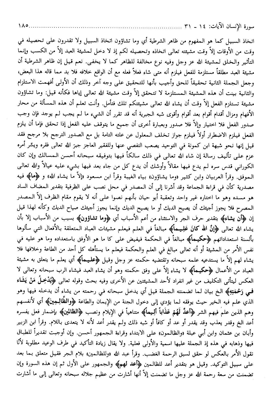 وإلّا فلا صدور وبعبارة أخرى أن جميع ما يتوقف عليه الفعل إذا تحقق فإما أن يلزم الفعل فيلزم الاضطرار أولا فيلزم جواز تخلف المعلول عن علته التامة بل مع الصدور الترجح بلا مرجح فقد قيل إنها نحو شبهة ابن كمونة في التوحيد يصعب التفصي عنها وللفقير العاجز جبر الله تعالى فقره ويسّر أمره عزم على تأليف رسالة إن شاء الله تعالى في ذلك سالكا فيها بتوفيقه سبحانه أحسن المسالك وإن كان الكوراني قدس سره لم يدع فيها مقالا وأوشك أن يدع كل من جاء بعد فيها بشيء عليه عيالا والله تعالى الموفق. وقرأ العربيان وابن كثير «وما يشاؤون» بياء الغيبة وقرأ ابن مسعود «إلّا ما يشاء الله» وما فيه مصدرية كأن في قراءة الجماعة وقد أشرنا إلى أن المصدر في محل نصب على الظرفية بتقدير المضاف الساد هو مسده وهو ما اختاره غير واحد وتعقبة أبو حيان بأنهم نصوا على أنه لا يقوم مقام الظرف إلّا المصدر المصرح فلا يجوز أجيئك أن يصيح الديك أو ما يصيح الديك وإنما يجوز أجيئك صياح الديك وكأنه لهذا قيل إن أَنْ يَشاءَ بتقدير حرف الجر والاستثناء من أعلم الأسباب أي وَما تَشاؤُنَ بسبب من الأسباب إلا بأن يشاء الله تعالى إِنَّ اللَّهَ كانَ عَلِيماً مبالغا في العلم فيعلم مشيئات العباد المتعلقة بالأفعال التي سألوها بألسنة استعداداتهم حَكِيماً مبالغا في الحكمة فيفيض على كما هو الأوفق باستعداده وما هو عليه في نفس الأمر من المشيئة أو أنه تعالى مبالغ في العلم والحكمة فيعلم ما يستأهله كل أحد من الطاعة وخلافها فلا يشاء لهم إلّا ما يستدعيه علمه سبحانه وتقتضيه حكمته عز وجل وقيل عَلِيماً أي يعلم ما يتعلق به مشيئة العباد من الأعمال حَكِيماً لا يشاء إلّا على وفق حكمته وهو أن يشاء العبد فيشاء الرب سبحانه وتعالى لا العكس ليتأتى التكليف من غير انفراد لأحد المشيئتين عن الأخرى وفيه بحث وقوله تعالى يُدْخِلُ مَنْ يَشاءُ فِي رَحْمَتِهِ إلخ بيان لما تضمنته الجملة قيل أي يدخل سبحانه في رحمته من يشاء أن يدخله فيها وهو الذي علم فيه الخير حيث يوفقه لما يؤدي إلى دخول الجنة من الإيمان والطاعة وَالظَّالِمِينَ أي لأنفسهم وهم الذين علم فيهم الشر أَعَدَّ لَهُمْ عَذاباً أَلِيماً متناهيا في الإيلام ونصب الظَّالِمِينَ بإضمار فعل يفسره أعد إلخ وقدر يعذب وقد يقدر أو عد أو كافأ أو شبه ذلك ولم يقدر أعد لأنه لا يتعدى باللام. وقرأ ابن الزبير وأبان بن عثمان وابن أبي عبلة «والظالمون» على الابتداء وقراءة الجمهور أحسن. وإن أوجبت تقديرا للطباق فيها وذهابه في هذه إذ الجملة عليها اسمية والأولى فعلية. ولا يقال زيادة التأكيد في طرف الوعيد مطلوبة لأنّا نقول الأمر بالعكس لو حقق لسبق الرحمة الغضب. وقرأ عبد الله «وللظالمين» بلام الجر فقيل متعلق بما بعد على سبيل التوكيد. وقيل هو بتقدير أعد للظالمين أَعَدَّ لَهُمْ والجمهور على الأول ثم إن هذه السورة وإن تضمنت من سعة رحمة الله عز وجل ما تضمنت إلّا أنها أشارت من عظيم جلاله سبحانه وتعالى إلى ما أشارت