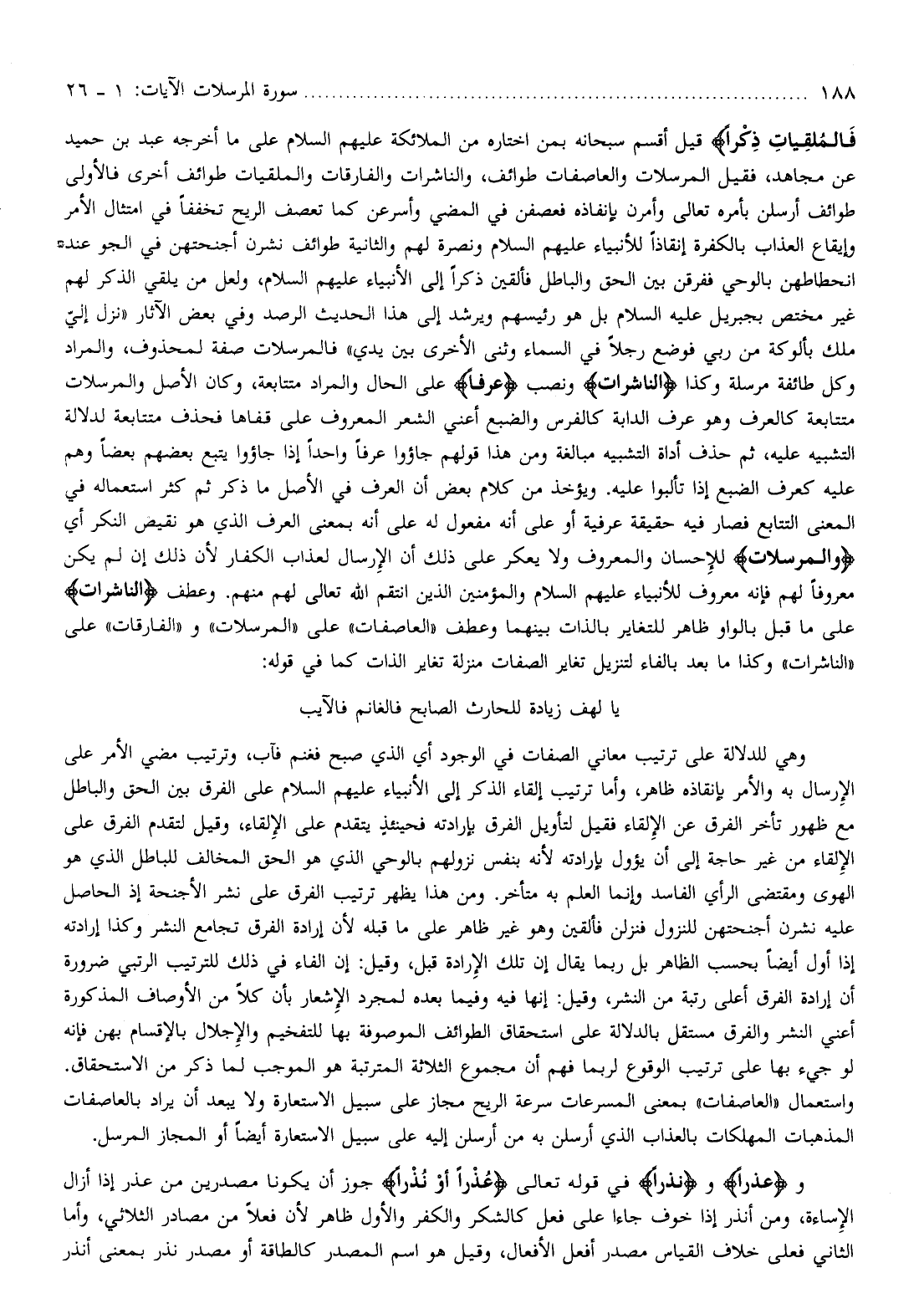 يا لهف زيادة للحارث الصابح فالغانم فالآيب وهي للدلالة على ترتيب معاني الصفات في الوجود أي الذي صبح فغنم فآب، وترتيب مضي الأمر على الإرسال به والأمر بإنقاذه ظاهر، وأما ترتيب إلقاء الذكر إلى الأنبياء عليهم السلام على الفرق بين الحق والباطل مع ظهور تأخر الفرق عن الإلقاء فقيل لتأويل الفرق بإرادته فحينئذ يتقدم على الإلقاء، وقيل لتقدم الفرق على الإلقاء من غير حاجة إلى أن يؤول بإرادته لأنه بنفس نزولهم بالوحي الذي هو الحق المخالف للباطل الذي هو الهوى ومقتضى الرأي الفاسد وإنما العلم به متأخر. ومن هذا يظهر ترتيب الفرق على نشر الأجنحة إذ الحاصل عليه نشرن أجنحتهن للنزول فنزلن فألقين وهو غير ظاهر على ما قبله لأن إرادة الفرق تجامع النشر وكذا إرادته إذا أول أيضا بحسب الظاهر بل ربما يقال إن تلك الإرادة قبل، وقيل: إن الفاء في ذلك للترتيب الرتبي ضرورة أن إرادة الفرق أعلى رتبة من النشر، وقيل: إنها فيه وفيما بعده لمجرد الإشعار بأن كلا من الأوصاف المذكورة أعني النشر والفرق مستقل بالدلالة على استحقاق الطوائف الموصوفة بها للتفخيم والإجلال بالإقسام بهن فإنه لو جيء بها على ترتيب الوقوع لربما فهم أن مجموع الثلاثة المترتبة هو الموجب لما ذكر من الاستحقاق.