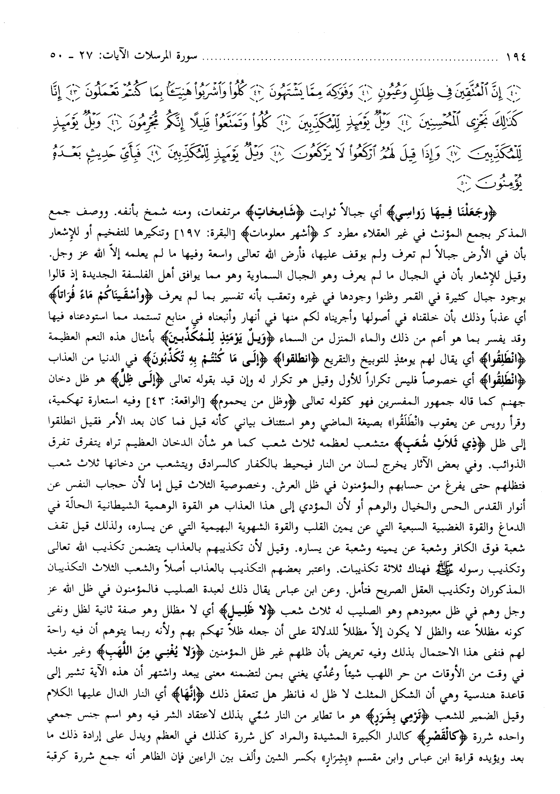 وقيل للإشعار بأن في الجبال ما لم يعرف وهو الجبال السماوية وهو مما يوافق أهل الفلسفة الجديدة إذ قالوا بوجود جبال كثيرة في القمر وظنوا وجودها في غيره وتعقب بأنه تفسير بما لم يعرف وَأَسْقَيْناكُمْ ماءً فُراتاً أي عذبا وذلك بأن خلقناه في أصولها وأجريناه لكم منها في أنهار وأنبعناه في منابع تستمد مما استودعناه فيها وقد يفسر بما هو أعم من ذلك والماء المنزل من السماء وَيْلٌ يَوْمَئِذٍ لِلْمُكَذِّبِينَ بأمثال هذه النعم العظيمة انْطَلِقُوا أي يقال لهم يومئذ للتوبيخ والتقريع انْطَلِقُوا إِلى ما كُنْتُمْ بِهِ تُكَذِّبُونَ في الدنيا من العذاب انْطَلِقُوا أي خصوصا فليس تكرارا للأول وقيل هو تكرار له وإن قيد بقوله تعالى إِلى ظِلٍّ هو ظل دخان جهنم كما قاله جمهور المفسرين فهو كقوله تعالى وَظِلٍّ مِنْ يَحْمُومٍ [الواقعة: 43] وفيه استعارة تهكمية، وقرأ رويس عن يعقوب «انطلقوا» بصيغة الماضي وهو استئناف بياني كأنه قيل فما كان بعد الأمر فقيل انطلقوا إلى ظل ذِي ثَلاثِ شُعَبٍ متشعب لعظمه ثلاث شعب كما هو شأن الدخان العظيم تراه يتفرق تفرق الذوائب. وفي بعض الآثار يخرج لسان من النار فيحيط بالكفار كالسرادق ويتشعب من دخانها ثلاث شعب فتظلهم حتى يفرغ من حسابهم والمؤمنون في ظل العرش. وخصوصية الثلاث قيل إما لأن حجاب النفس عن أنوار القدس الحس والخيال والوهم أو لأن المؤدي إلى هذا العذاب هو القوة الوهمية الشيطانية الحالّة في الدماغ والقوة الغضبية السبعية التي عن يمين القلب والقوة الشهوية البهيمية التي عن يساره، ولذلك قيل تقف شعبة فوق الكافر وشعبة عن يمينه وشعبة عن يساره. وقيل لأن تكذيبهم بالعذاب يتضمن تكذيب الله تعالى وتكذيب رسوله صلّى الله عليه وسلم فهناك ثلاثة تكذيبات. واعتبر بعضهم التكذيب بالعذاب أصلا والشعب الثلاث التكذيبان المذكوران وتكذيب العقل الصريح فتأمل. وعن ابن عباس يقال ذلك لعبدة الصليب فالمؤمنون في ظل الله عز وجل وهم في ظل معبودهم وهو الصليب له ثلاث شعب لا ظَلِيلٍ أي لا مظلل وهو صفة ثانية لظل ونفى كونه مظللا عنه والظل لا يكون إلّا مظللا للدلالة على أن جعله ظلا تهكم بهم ولأنه ربما يتوهم أن فيه راحة لهم فنفى هذا الاحتمال بذلك وفيه تعريض بأن ظلهم غير ظل المؤمنين وَلا يُغْنِي مِنَ اللَّهَبِ وغير مفيد في وقت من الأوقات من حر اللهب شيئا وعدّي يغني بمن لتضمنه معنى يبعد واشتهر أن هذه الآية تشير إلى قاعدة هندسية وهي أن الشكل المثلث لا ظل له فانظر هل تتعقل ذلك إِنَّها أي النار الدال عليها الكلام وقيل الضمر للشعب تَرْمِي بِشَرَرٍ هو ما تطاير من النار سمّي بذلك لاعتقاد الشر فيه وهو اسم جنس جمعي واحده شررة كَالْقَصْرِ كالدار الكبيرة المشيدة والمراد كل شررة كذلك في العظم ويدل على إرادة ذلك ما بعد ويؤيده قراءة ابن عباس وابن مقسم «بشرار» بكسر الشين وألف بين الراءين فإن الظاهر أنه جمع شررة كرقبة