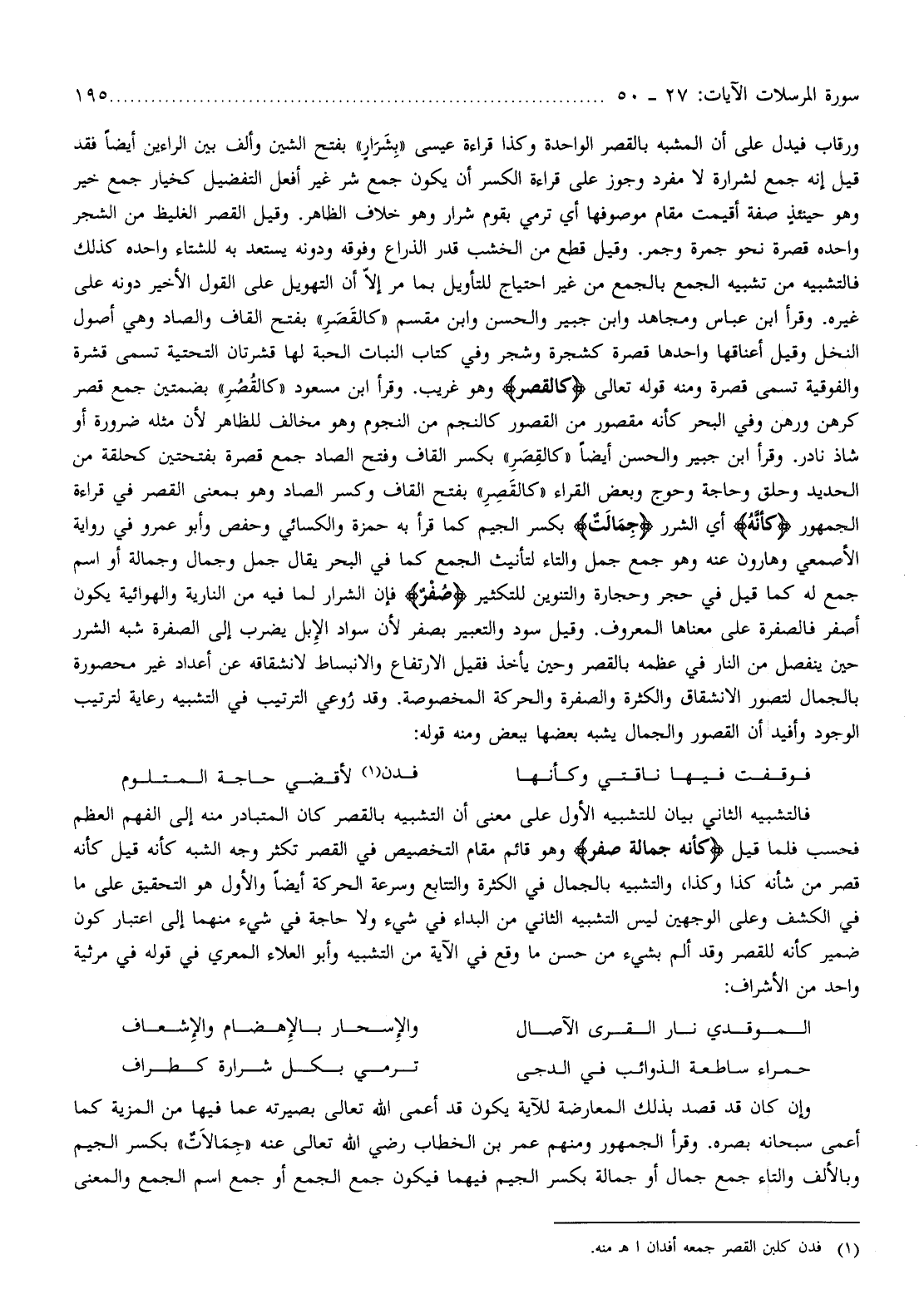 فالتشبيه الثاني بيان للتشبيه الأول على معنى أن التشبيه بالقصر كان المتبادر منه إلى الفهم العظم فحسب فلما قيل كَأَنَّهُ جِمالَتٌ صُفْرٌ وهو قائم مقام التخصيص في القصر تكثر وجه الشبه كأنه قيل كأنه قصر من شأنه كذا وكذا، والتشبيه بالجمال في الكثرة والتتابع وسرعة الحركة أيضا والأول هو التحقيق على ما في الكشف وعلى الوجهين ليس التشبيه الثاني من البداء في شيء ولا حاجة في شيء منهما إلى اعتبار كون ضمير كأنه للقصر وقد ألم بشيء من حسن ما وقع في الآية من التشبيه وأبو العلاء المعري في قوله في مرثية واحد من الأشراف: