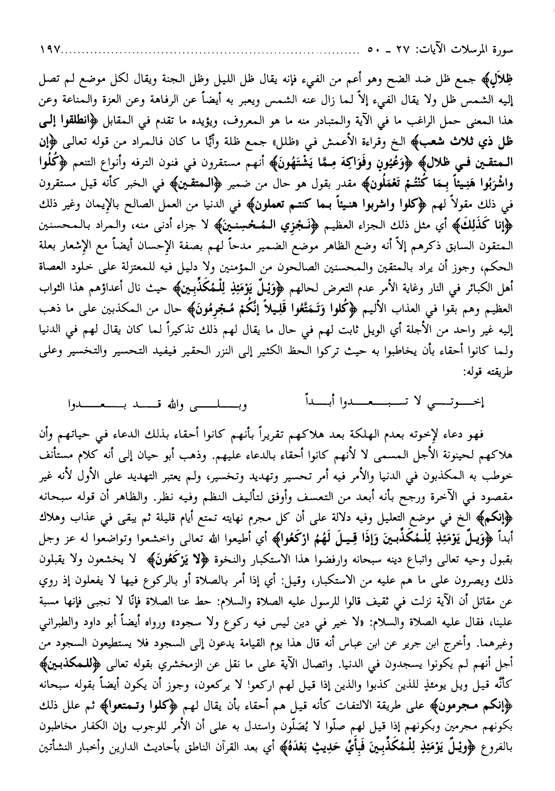 لما زال عنه الشمس ويعبر به أيضا عن الرفاهة وعن العزة والمناعة وعن هذا المعنى حمل الراغب ما في الآية والمتبادر منه ما هو المعروف، ويؤيده ما تقدم في المقابل انْطَلِقُوا إِلى ظِلٍّ ذِي ثَلاثِ شُعَبٍ إلخ وقراءة الأعمش في «ظلل» جمع ظلة وأيّا ما كان فالمراد من قوله تعالى إِنَّ الْمُتَّقِينَ فِي ظِلالٍ وَعُيُونٍ وَفَواكِهَ مِمَّا يَشْتَهُونَ أنهم مستقرون في فنون الترفه وأنواع التنعم كُلُوا وَاشْرَبُوا هَنِيئاً بِما كُنْتُمْ تَعْمَلُونَ مقدر بقول هو حال من ضمير الْمُتَّقِينَ في الخبر كأنه قيل مستقرون في ذلك مقولا لهم كُلُوا وَاشْرَبُوا هَنِيئاً بِما كُنْتُمْ تَعْمَلُونَ في الدنيا من العمل الصالح بالإيمان وغير ذلك إِنَّا كَذلِكَ أي مثل ذلك الجزاء العظيم نَجْزِي الْمُحْسِنِينَ لا جزاء أدنى منه، والمراد بالمحسنين المتقون السابق ذكرهم إلّا أنه وضع الظاهر موضع الضمير مدحا لهم بصفة الإحسان أيضا مع الإشعار بعلة الحكم، وجوز أن يراد بالمتقين والمحسنين الصالحون من المؤمنين ولا دليل فيه للمعتزلة على خلود العصاة أهل الكبائر في النار وغاية الأمر عدم التعرض لحالهم وَيْلٌ يَوْمَئِذٍ لِلْمُكَذِّبِينَ حيث نال أعداؤهم هذا الثواب العظيم وهم بقوا في العذاب الأليم كُلُوا وَتَمَتَّعُوا قَلِيلًا إِنَّكُمْ مُجْرِمُونَ حال من المكذبين على ما ذهب إليه غير واحد من الأجلة أي الويل ثابت لهم في حال ما يقال لهم ذلك تذكيرا لما كان يقال لهم في الدنيا ولما كانوا أحقاء بأن يخاطبوا به حيث تركوا الحظ الكثير إلى النزر الحقير فيفيد التحسير والتخسير وعلى طريقته قوله: