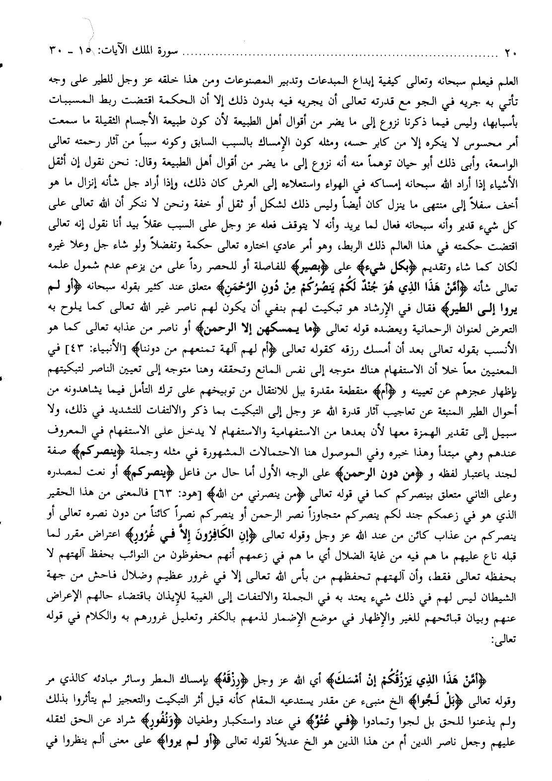 العلم فيعلم سبحانه وتعالى كيفية إبداع المبدعات وتدبير المصنوعات ومن هذا خلقه عز وجل للطير على وجه تأتي به جريه في الجو مع قدرته تعالى أن يجريه فيه بدون ذلك إلا أن الحكمة اقتضت ربط المسببات بأسبابها، وليس فيما ذكرنا نزوع إلى ما يضر من أقوال أهل الطبيعة لأن كون طبيعة الأجسام الثقيلة ما سمعت أمر محسوس لا ينكره إلا من كابر حسه، ومثله كون الإمساك بالسبب السابق وكونه سببا من آثار رحمته تعالى الواسعة، وأبى ذلك أبو حيان توهما منه أنه نزوع إلى ما يضر من أقوال أهل الطبيعة وقال: نحن نقول إن أثقل الأشياء إذا أراد الله سبحانه إمساكه في الهواء واستعلاءه إلى العرش كان ذلك، وإذا أراد جل شأنه إنزال ما هو أخف سفلا إلى منتهى ما ينزل كان أيضا وليس ذلك لشكل أو ثقل أو خفة ونحن لا ننكر أن الله تعالى على كل شيء قدير وأنه سبحانه فعال لما يريد وأنه لا يتوقف فعله عز وجل على السبب عقلا بيد أنا نقول إنه تعالى اقتضت حكمته في هذا العالم ذلك الربط، وهو أمر عادي اختاره تعالى حكمة وتفضلا ولو شاء جل وعلا غيره لكان كما شاء وتقديم بِكُلِّ شَيْءٍ على بَصِيرٌ للفاصلة أو للحصر ردا على من يزعم عدم شمول علمه تعالى شأنه أَمَّنْ هذَا الَّذِي هُوَ جُنْدٌ لَكُمْ يَنْصُرُكُمْ مِنْ دُونِ الرَّحْمنِ متعلق عند كثير بقوله سبحانه أَوَلَمْ يَرَوْا إِلَى الطَّيْرِ فقال في الإرشاد هو تبكيت لهم بنفي أن يكون لهم ناصر غير الله تعالى كما يلوح به التعرض لعنوان الرحمانية ويعضده قوله تعالى ما يُمْسِكُهُنَّ إِلَّا الرَّحْمنُ أو ناصر من عذابه تعالى كما هو الأنسب بقوله تعالى بعد أن أمسك رزقه كقوله تعالى أَمْ لَهُمْ آلِهَةٌ تَمْنَعُهُمْ مِنْ دُونِنا [الأنبياء: 43] في المعنيين معا خلا أن الاستفهام هناك متوجه إلى نفس المانع وتحققه وهنا متوجه إلى تعيين الناصر لتبكيتهم بإظهار عجزهم عن تعيينه و (أم) منقطعة مقدرة ببل للانتقال من توبيخهم على ترك التأمل فيما يشاهدونه من أحوال الطير المنبئة عن تعاجيب آثار قدرة الله عز وجل إلى التبكيت بما ذكر والالتفات للتشديد في ذلك، ولا سبيل إلى تقدير الهمزة معها لأن بعدها من الاستفهامية والاستفهام لا يدخل على الاستفهام في المعروف عندهم وهي مبتدأ وهذا خبره وفي الموصول هنا الاحتمالات المشهورة في مثله وجملة يَنْصُرُكُمْ صفة لجند باعتبار لفظه ومِنْ دُونِ الرَّحْمنِ على الوجه الأول أما حال من فاعل يَنْصُرُكُمْ أو نعت لمصدره وعلى الثاني متعلق بينصركم كما في قوله تعالى مَنْ يَنْصُرُنِي مِنَ اللَّهِ [هود: 63] فالمعنى من هذا الحقير الذي هو في زعمكم جند لكم ينصركم متجاوزا نصر الرحمن أو ينصركم نصرا كائنا من دون نصره تعالى أو ينصركم من عذاب كائن من عند الله عز وجل وقوله تعالى إِنِ الْكافِرُونَ إِلَّا فِي غُرُورٍ اعتراض مقرر لما قبله ناع عليهم ما هم فيه من غاية الضلال أي ما هم في زعمهم أنهم محفوظون من النوائب بحفظ آلهتهم لا بحفظه تعالى فقط، وأن آلهتهم تحفظهم من بأس الله تعالى إلا في غرور عظيم وضلال فاحش من جهة الشيطان ليس لهم في ذلك شيء يعتد به في الجملة والالتفات إلى الغيبة للإيذان باقتضاء حالهم الإعراض عنهم وبيان قبائحهم للغير والإظهار في موضع الإضمار لذمهم بالكفر وتعليل غرورهم به والكلام في قوله تعالى: